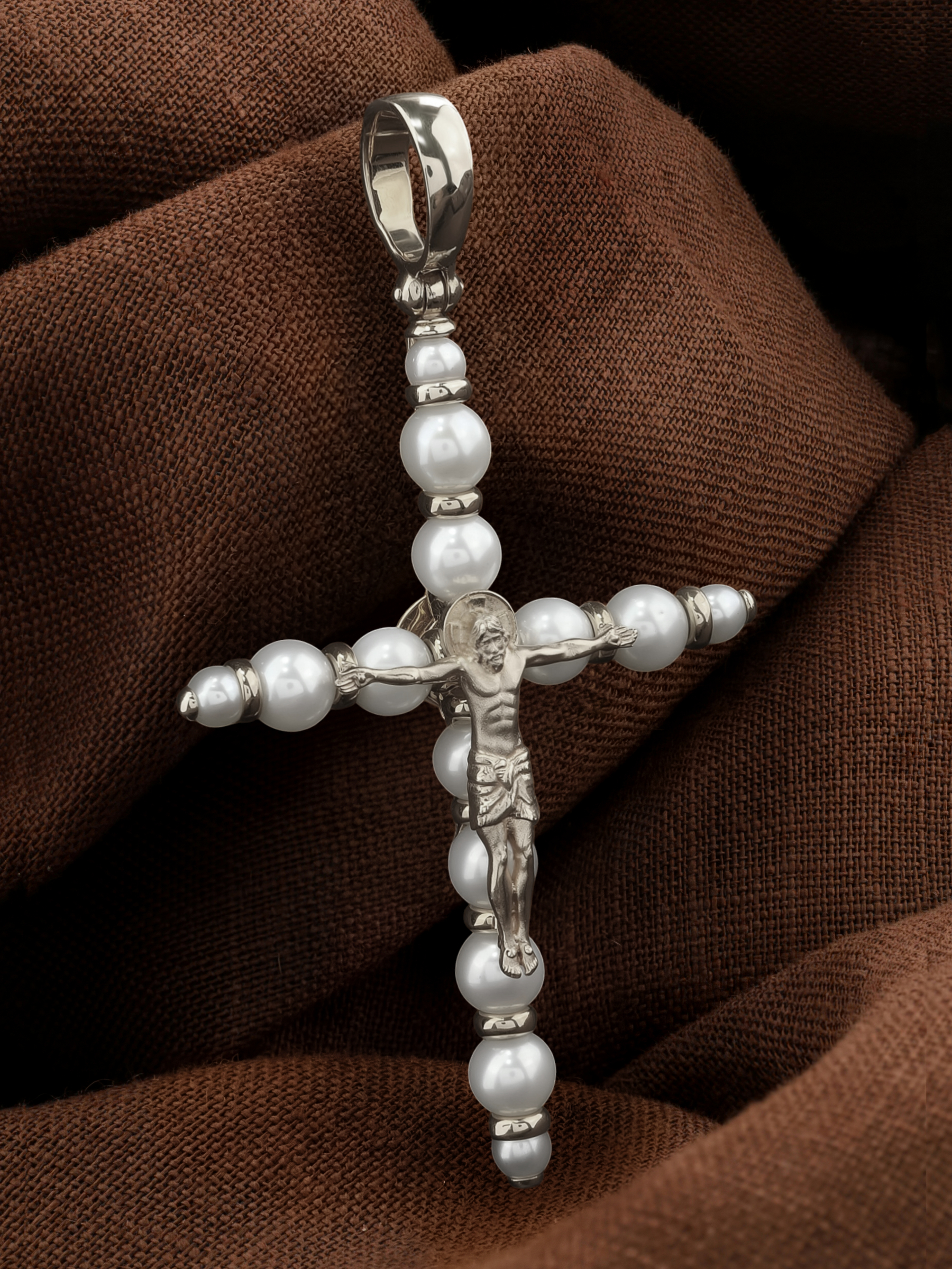 На лицевой стороне креста изображено Распятие Господа и Спасителя нашего Иисуса Христа. Своими крестными страданиями Господь смыл наши грехи, покрыл наш долг перед Богом или, на языке Писания, нас «искупил». В Голгофе сокрыта непостижимая тайна бесконечной правды и любви Бога. Крест стал символом победы добра над злом, жизни над смертью, напоминанием бесконечной Божьей любви, предметом радости. Воплотившийся Сын Божий Своею кровью освятил крест и сделал его проводником Своей благодати, источником освящения верующих. На верхней табличке, выше головы Иисуса, расположена надпись, составленная Понтием Пилатом — «IНЦI». Она означает «Иисус Назорей, Царь Иудейский». Надпись «IC» «ХC», означает Иисус Христос, помещаются на разных сторонах поперечной перекладины креста. Христос в Своей Божественной любви, над которой смерть не властна и которая, страдая, и не страдает в обычном смысле, простирает к людям со Креста Свои объятия, в которые призывается и привлекается весь мир. Поэтому Тело Его не висит, а торжественно покоится на Кресте.