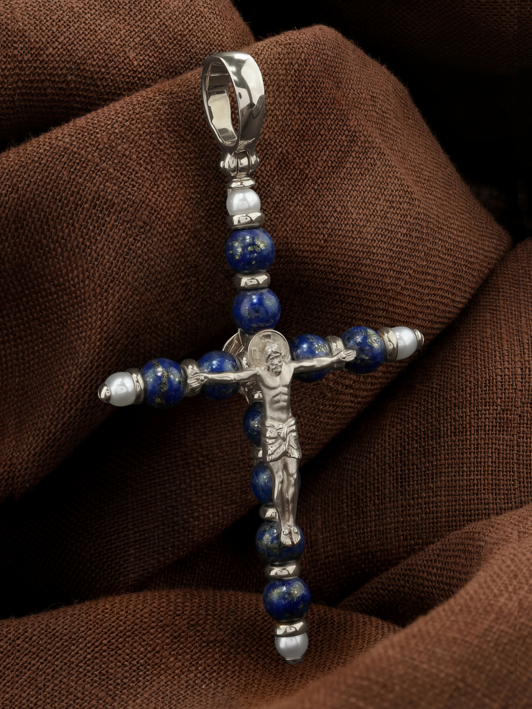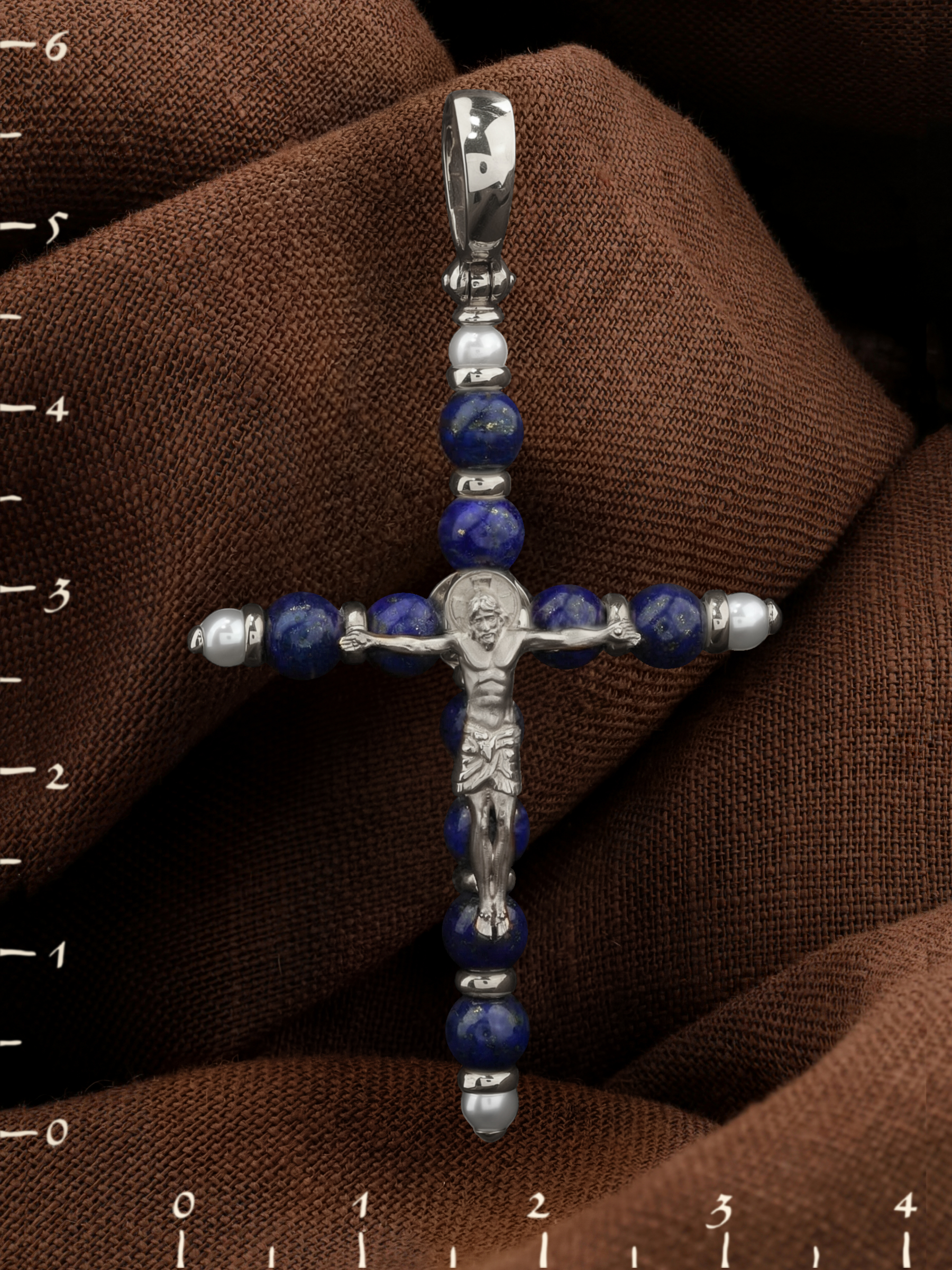Крест из белого золота c жемчугом и лазуритом