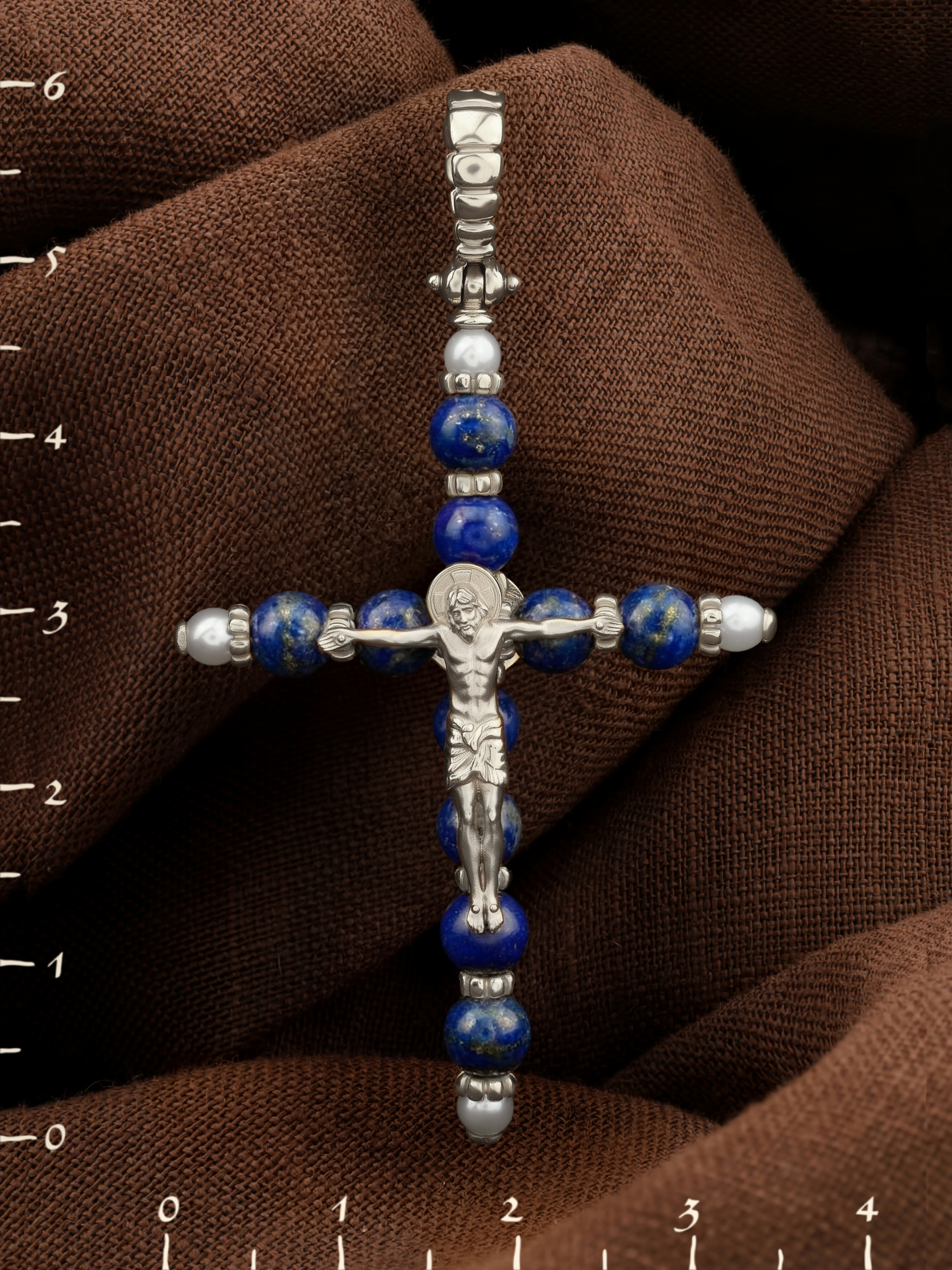 На лицевой стороне креста изображено Распятие Господа и Спасителя нашего Иисуса Христа. Своими крестными страданиями Господь смыл наши грехи, покрыл наш долг перед Богом или, на языке Писания, нас «искупил». В Голгофе сокрыта непостижимая тайна бесконечной правды и любви Бога. Крест стал символом победы добра над злом, жизни над смертью, напоминанием бесконечной Божьей любви, предметом радости. Воплотившийся Сын Божий Своею кровью освятил крест и сделал его проводником Своей благодати, источником освящения верующих. На верхней табличке, выше головы Иисуса, расположена надпись, составленная Понтием Пилатом — «IНЦI». Она означает «Иисус Назорей, Царь Иудейский». Надпись «IC» «ХC», означает Иисус Христос, помещаются на разных сторонах поперечной перекладины креста. Христос в Своей Божественной любви, над которой смерть не властна и которая, страдая, и не страдает в обычном смысле, простирает к людям со Креста Свои объятия, в которые призывается и привлекается весь мир. Поэтому Тело Его не висит, а торжественно покоится на Кресте.