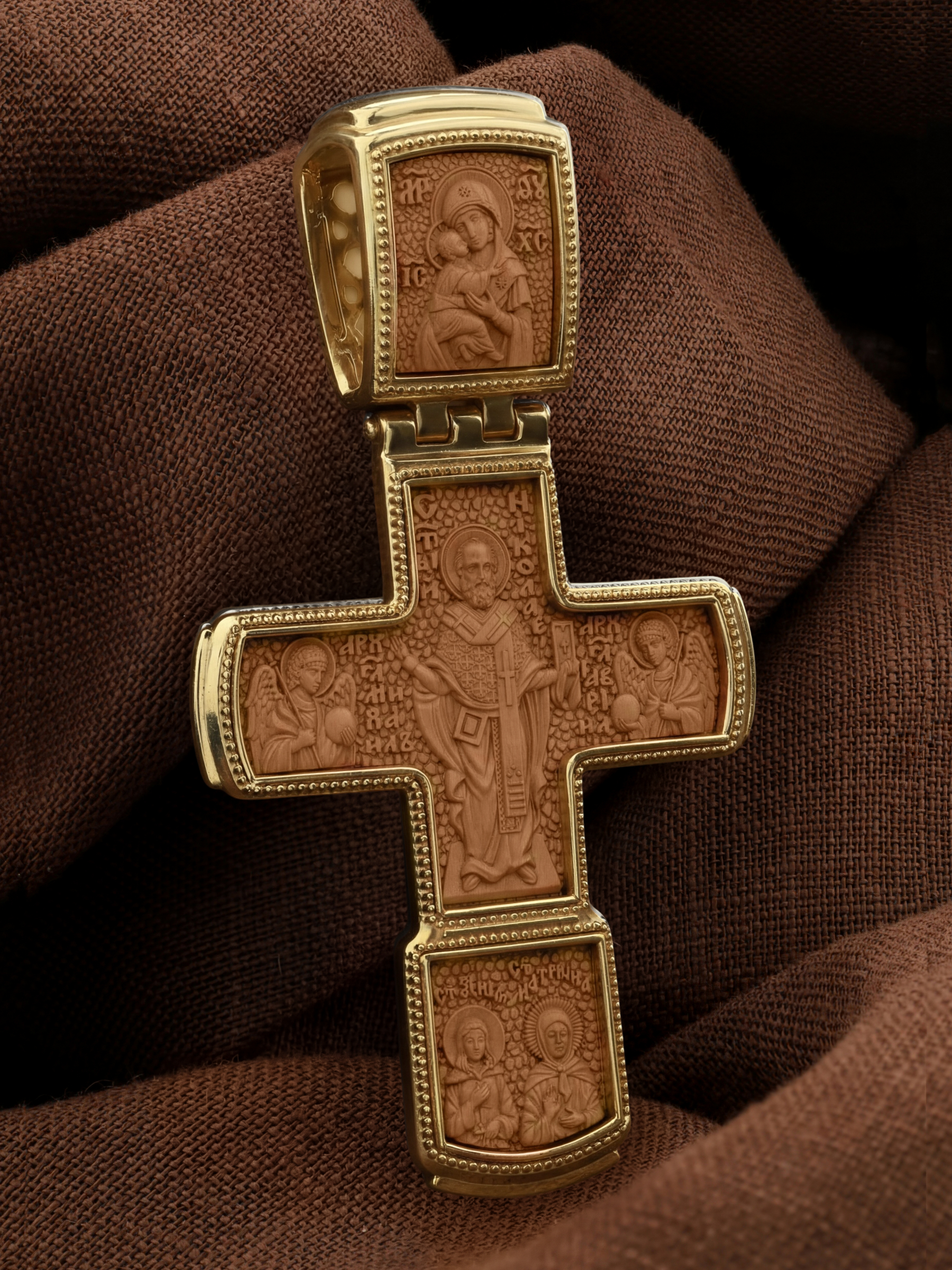 На кресте изображено Распятие Господа нашего Иисуса Христа. Ему предстоят Святая Мария Магдалина, Пресвятая Богородица, апостол Иоанн и Святой Иосиф, свидетели крестных страданий Господа. На оглавии помещена икона Святой Троицы, на которой запечатлено явление Триединого Бога праотцу Аврааму в виде трех ангелов. В нижнем клейме изображено Чудо Святого Георгия о змие. Великомученик Георгий почитается как покровитель воинов, защитник от злых сил, помощник в духовной борьбе.