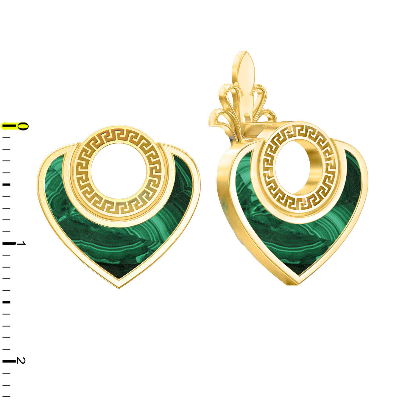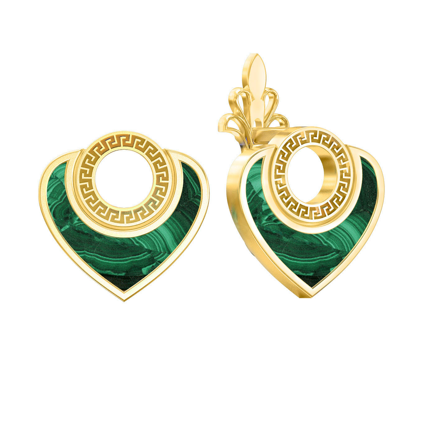 В центре композиции каждого украшения расположен узнаваемый греческий орнамент, придающий серьгам оттенок античного величия. Использование лимонного золота подчеркивает насыщенность зелёного оттенка малахита, создавая гармоничный и дорогой контраст. В каждой паре серег использовано две вставки в форме сердца, что делает их прекрасным подарком, символизирующим чувства и преданность.