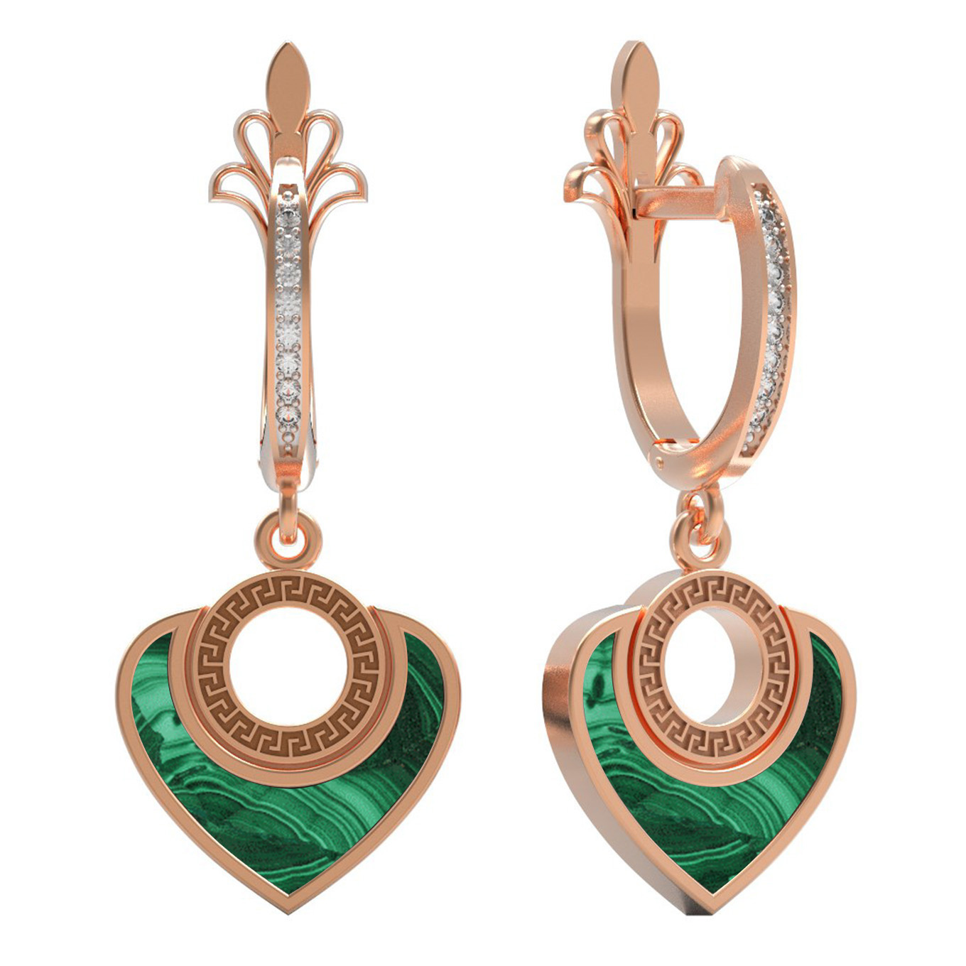 Серьги из красного золота 585 пробы — это воплощение элегантности и глубокого смысла. Изделие из коллекции De Luxe — С любовью привлекает внимание своим утонченным дизайном в форме сердец, который символизирует искренние чувства и гармонию. Благородный оттенок красного золота подчеркивает природную красоту вставок: насыщенного зеленого малахита и сверкающих белых фианитов.