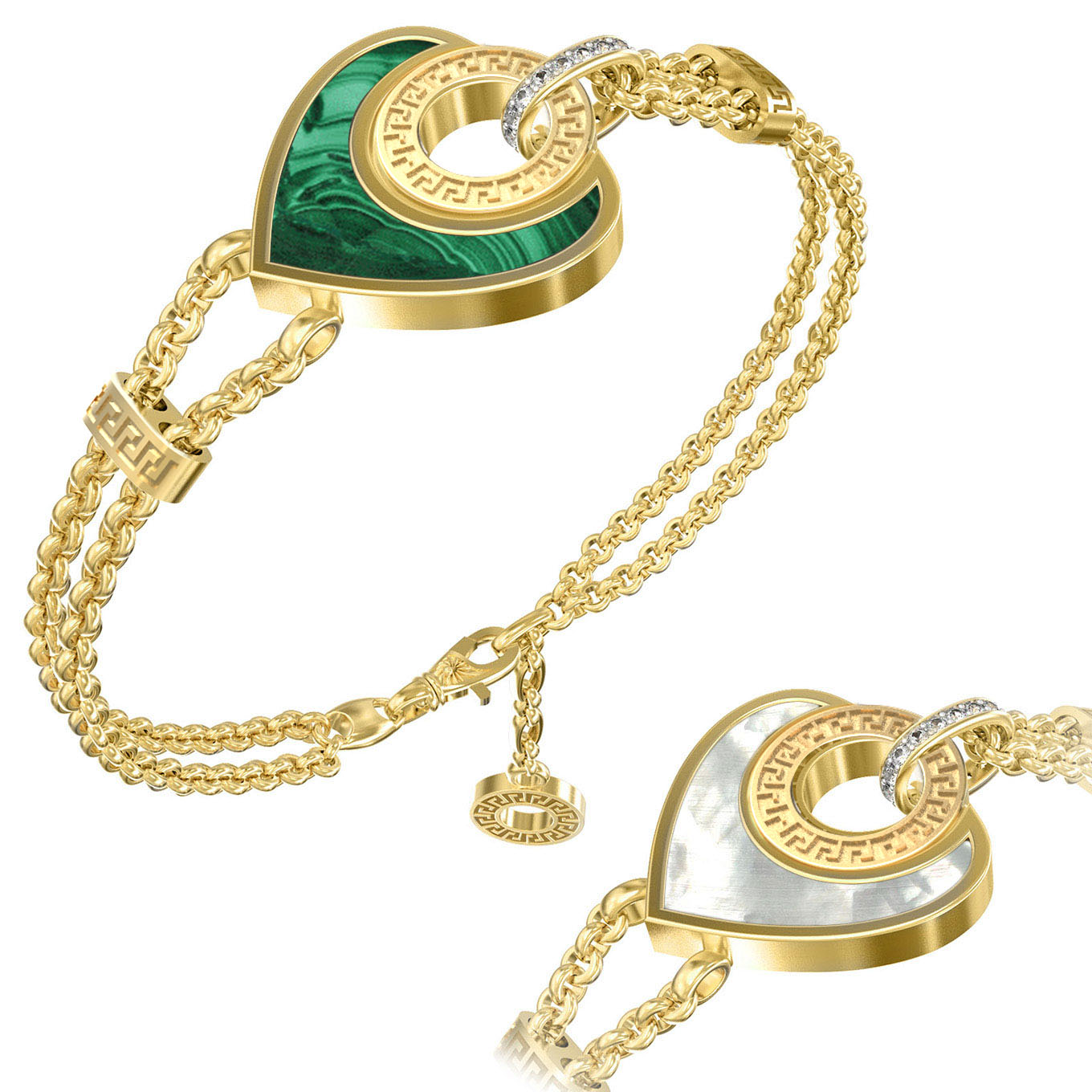 Центральный декоративный элемент украшен 17 вставками. Глубокий зеленый оттенок малахита в сочетании с нежным перламутром создает завораживающий контраст, а сверкающий фианит добавляет браслету необходимого блеска. Камни круглой и сердцевидной формы подчеркивают филигранную работу ювелиров. Тонкое плетение основы обеспечивает комфортную посадку на запястье.