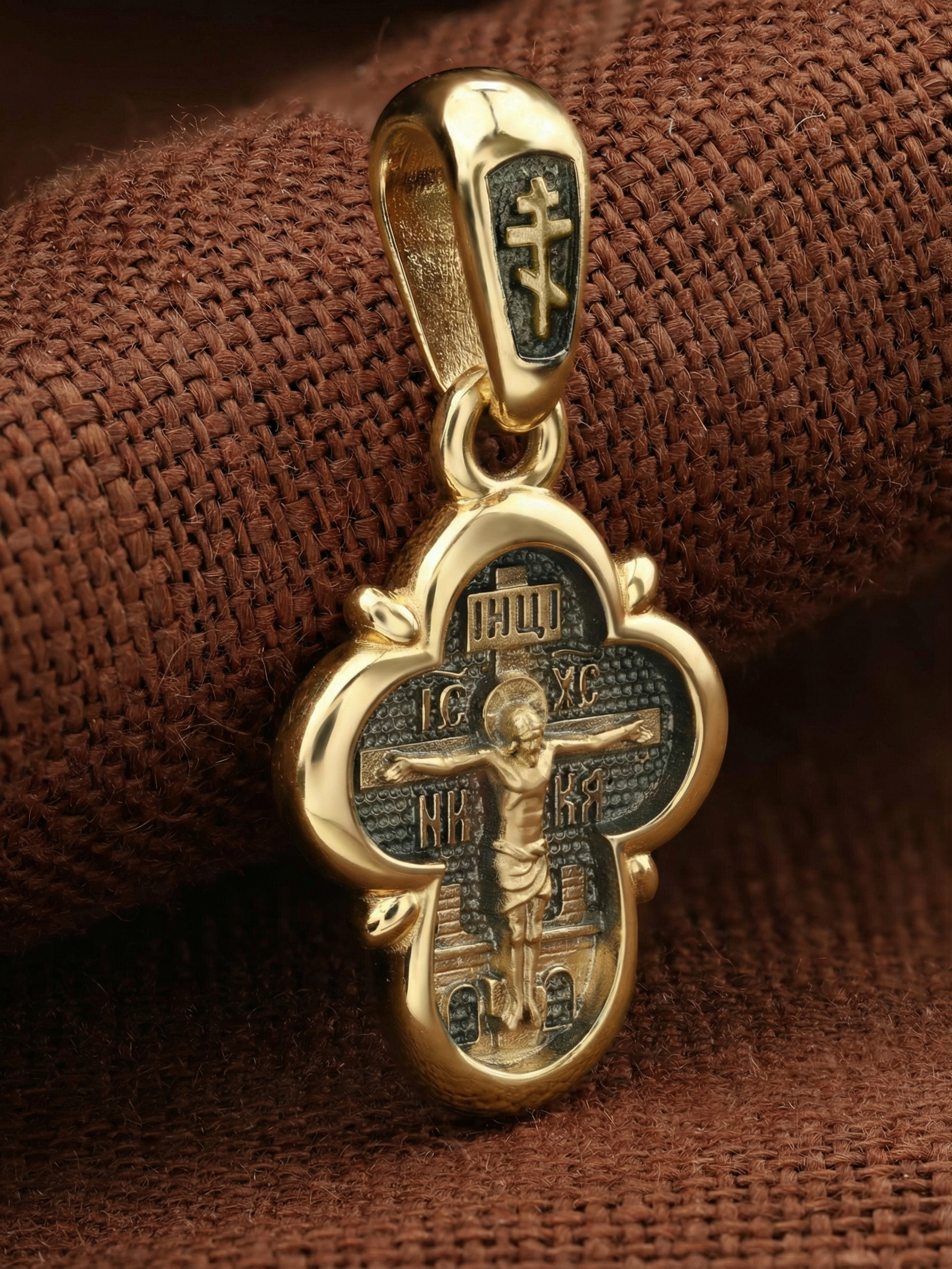 На лицевой стороне креста изображено Распятие Господа и Спасителя нашего Иисуса Христа, отдавшего Себя на смерть, для искупления грехов мира. Крест является символом жертвенной любви Всеблагого Бога к падшим людям, всепобеждающим духовным оружием христиан, основанием и средоточием церковной жизни. Господь сказал: «кто хочет идти за Мною, отвергнись себя, и возьми крест свой, и следуй за Мною». (Мк. 8: 34). На верхней табличке, выше головы Иисуса, расположена надпись, составленная Понтием Пилатом — «IНЦI». Она означает «Иисус Назорей, Царь Иудейский». Надпись «IC» «ХC», означает Иисус Христос, помещается на разных сторонах поперечной перекладины креста. Рядом — слово «НИКА», что означает «победитель». За крестом высится Иерусалимская стена. Над вершиной Распятия, на кулонном кольце, помещен крест.