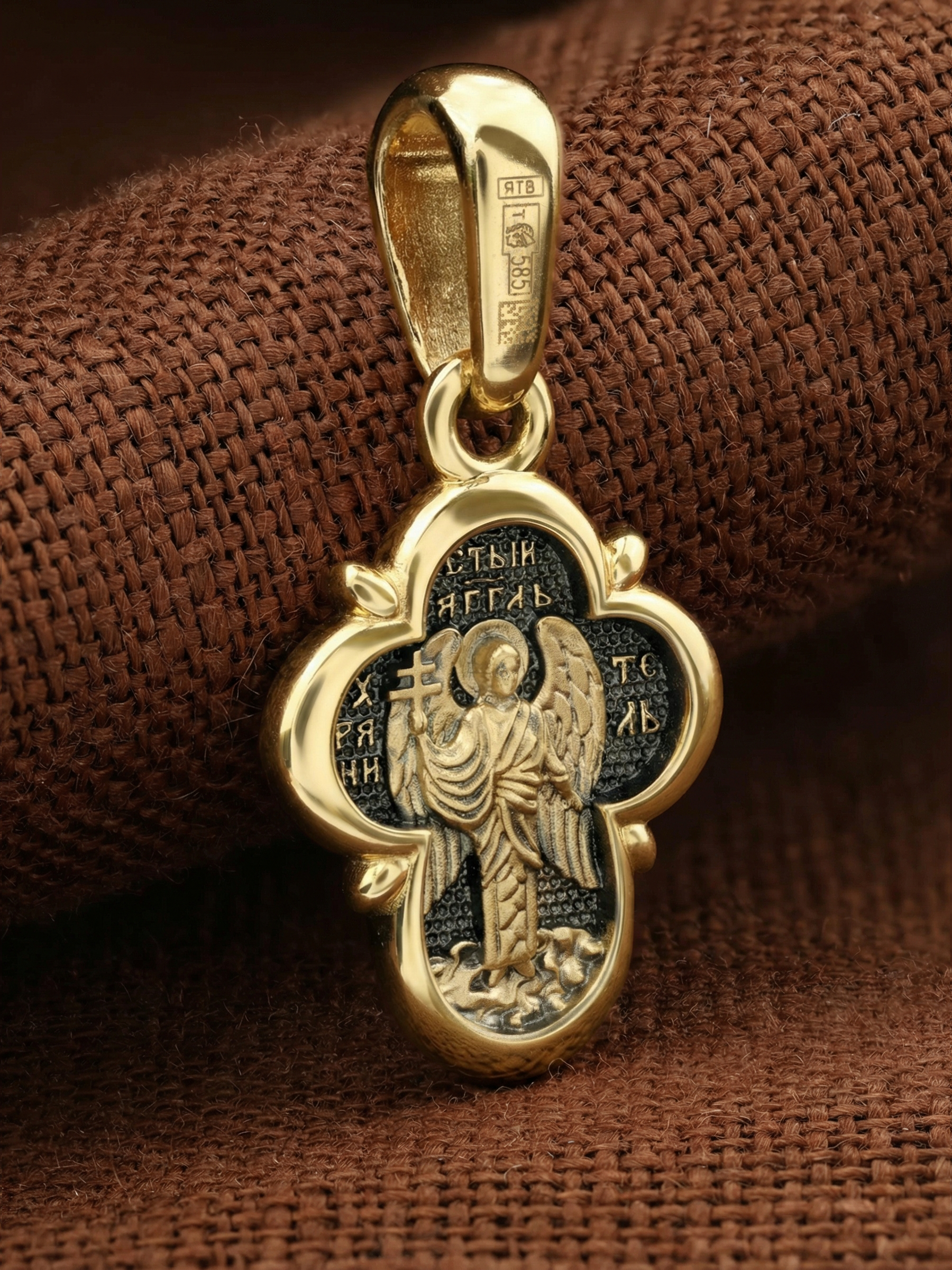 На оборотной стороне креста изображен Святой Ангел-Хранитель держащий в правой руке крест. Ангел-Хранитель — это Ангел приставляемый Богом к человеку при крещении для охраны и помощи в добрых делах. Он невидимо находится при человеке на протяжении всей его жизни, если человек сохраняет в себе любовь к Богу и истинную веру перед Ним. Ангел-Xранитель делают для нас все, что служит к истинному нашему благу и спасению. Невидимо пребывая при нас постоянно, он, руководствуя нас ко спасению, не только по нашему желанию таинственно наставляет нас на все доброе и полезное, не только возносит наши молитвы к Богу, но еще и сам от себя охраняют и защищают нас от врагов видимых и невидимых и ходатайствует за нас пред Богом. Ангел-Хранитель так любит нас, как никто на земле любить не может. Одного лишь каждому из нас он желает — спасения души; к этому он направляет все свои заботы.