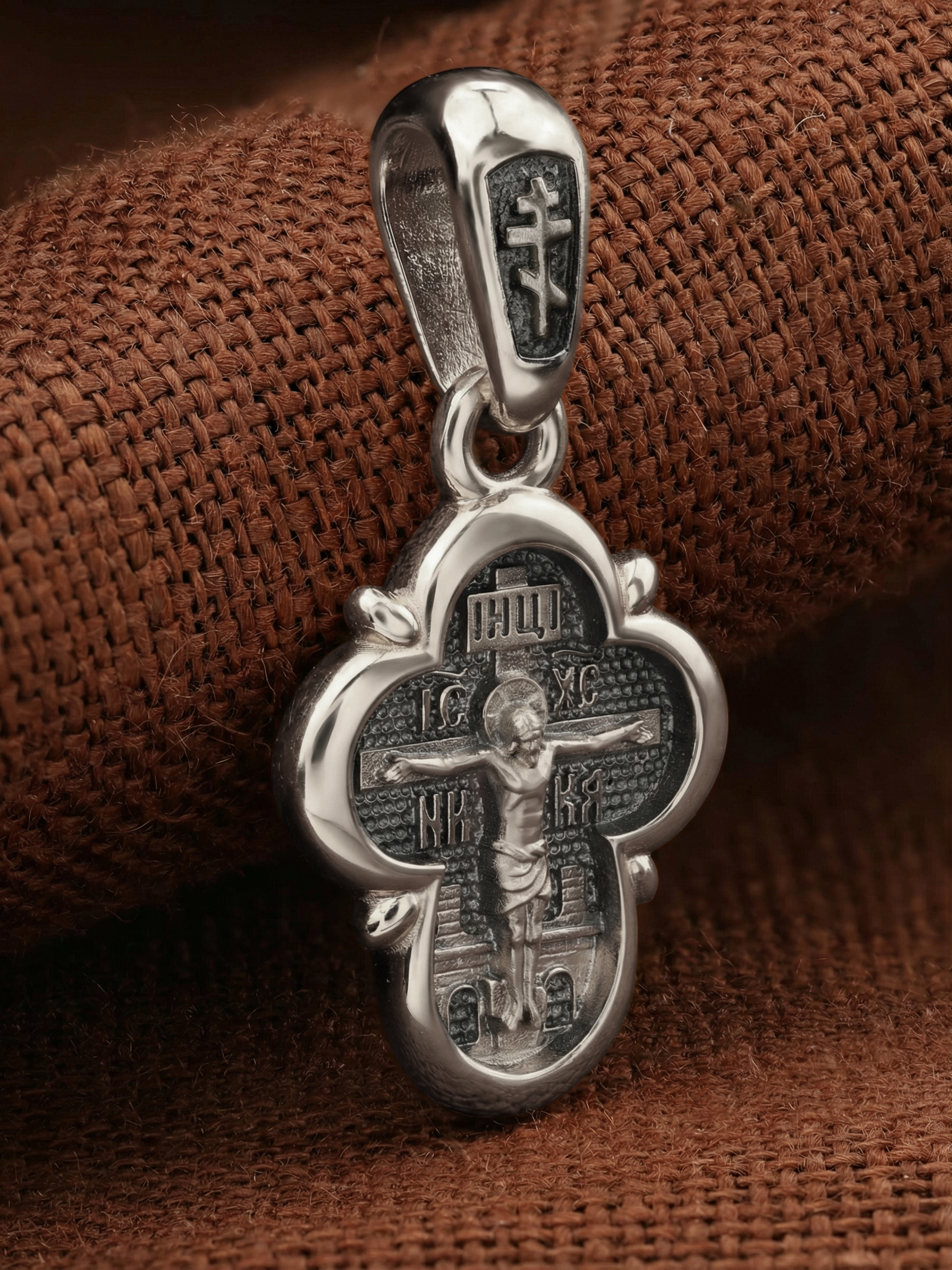 На лицевой стороне креста изображено Распятие Господа и Спасителя нашего Иисуса Христа, отдавшего Себя на смерть, для искупления грехов мира. Крест является символом жертвенной любви Всеблагого Бога к падшим людям, всепобеждающим духовным оружием христиан, основанием и средоточием церковной жизни. Господь сказал: «кто хочет идти за Мною, отвергнись себя, и возьми крест свой, и следуй за Мною». (Мк. 8: 34). На верхней табличке, выше головы Иисуса, расположена надпись, составленная Понтием Пилатом — «IНЦI». Она означает «Иисус Назорей, Царь Иудейский». Надпись «IC» «ХC», означает Иисус Христос, помещается на разных сторонах поперечной перекладины креста. Рядом — слово «НИКА», что означает «победитель». За крестом высится Иерусалимская стена. Над вершиной Распятия, на кулонном кольце, помещен крест.