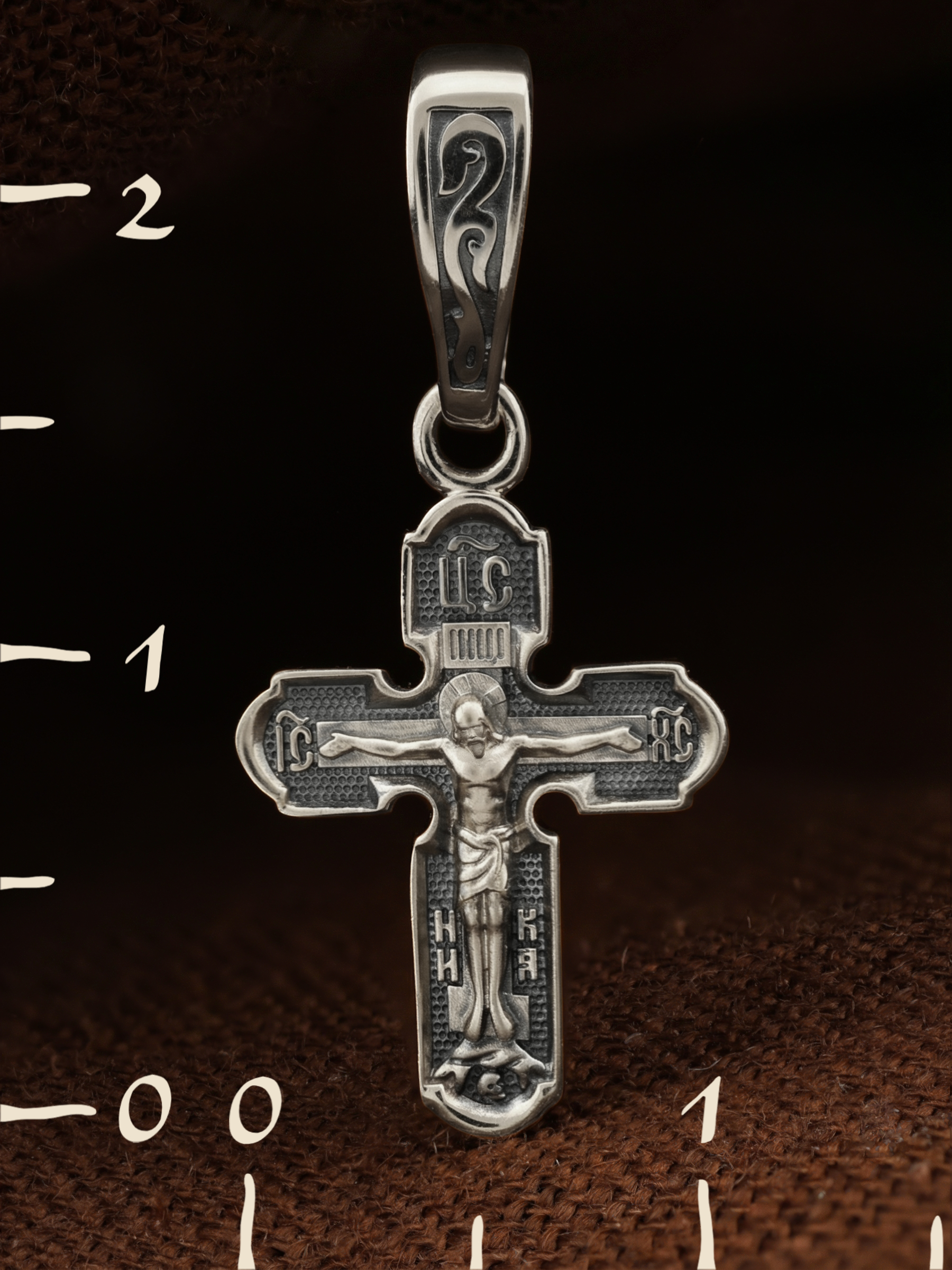 На лицевой стороне креста изображено Распятие Господа и Спасителя нашего Иисуса Христа, отдавшего Себя на смерть для искупления грехов мира. Крест является символом жертвенной любви Всеблагого Бога к падшим людям, всепобеждающим духовным оружием христиан, основанием и средоточием церковной жизни. Над вершиной Распятия помещена надпись «Царь Славы». На верхней перекладине расположена надпись «IНЦI». Она символизирует титло — табличку, на которой, согласно Евангелию, было начертано: Иисус Назорей, Царь Иудейский. Надпись «IC» «ХC»», означает Иисус Христос, помещаются на разных сторонах поперечной перекладины креста. Ниже помещена надпись «НИКА», что означает «победитель». Крест стоит на горе камней, символизирующих Голгофу. Под подножием Креста изображена покоящаяся голова (череп) Адама.
