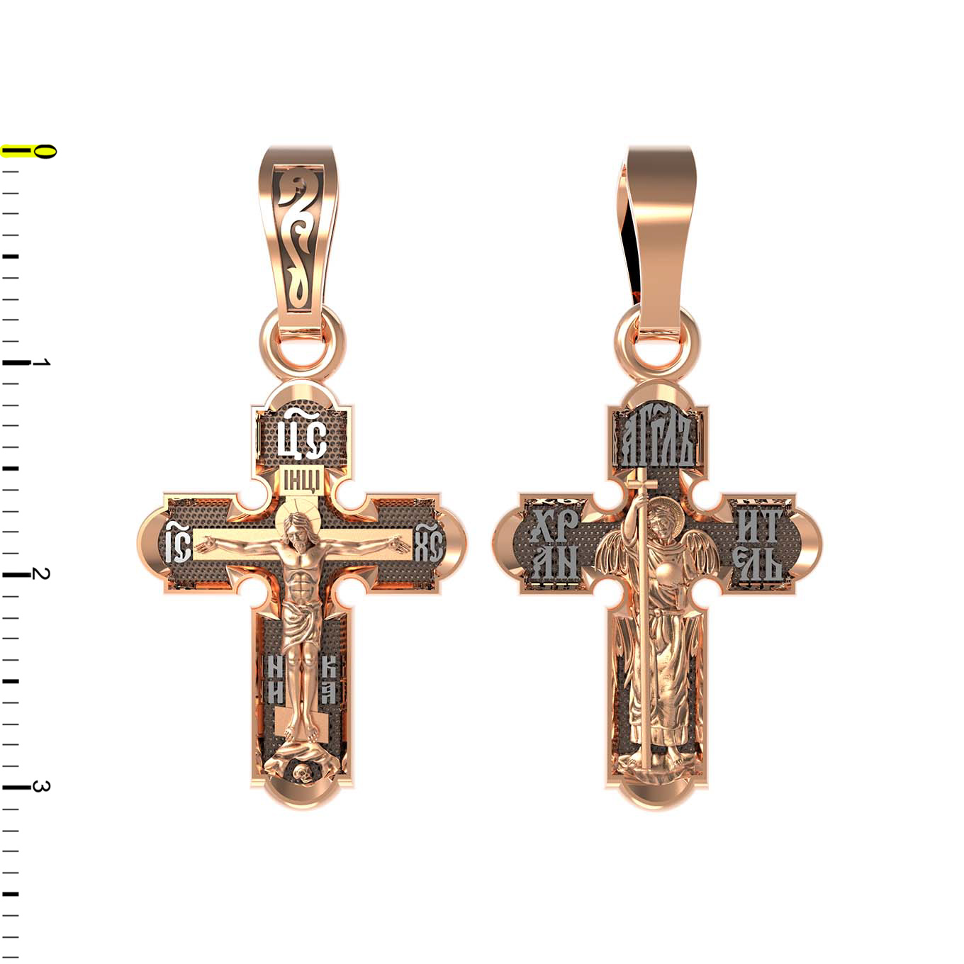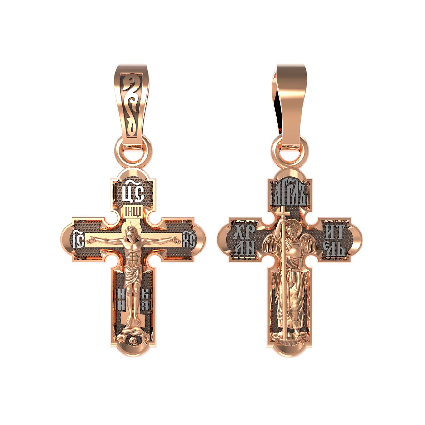 На оборотной стороне креста изображен святой Ангел-Хранитель в виде прекрасного юноши держащего в правой руке крест, а в левой — сферу. Ангел-Хранитель — это Ангел приставляемый Богом к человеку при крещении для охраны и помощи в добрых делах. Невидимо пребывая при нас постоянно, он, руководствуя нас ко спасению, не только по нашему желанию таинственно наставляет нас на все доброе и полезное, не только возносит наши молитвы к Богу, но еще и сам от себя охраняют и защищают нас от врагов видимых и невидимых, ходатайствует за нас пред Богом.