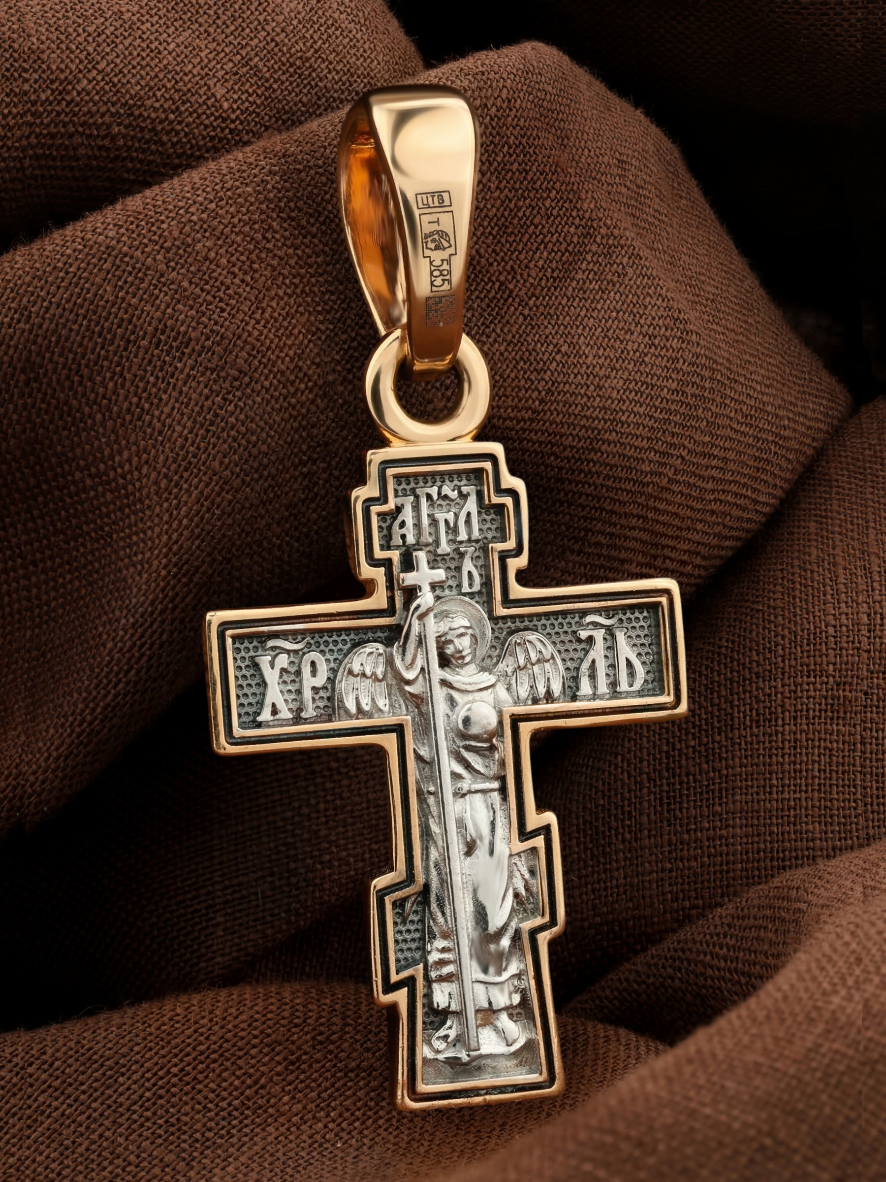 На оборотной стороне креста изображен святой Ангел-Хранитель в виде прекрасного юноши держащего в правой руке крест, а в левой — сферу. Ангел-Хранитель — это Ангел приставляемый Богом к человеку при крещении для охраны и помощи в добрых делах. Невидимо пребывая при нас постоянно, он, руководствуя нас ко спасению, не только по нашему желанию таинственно наставляет нас на все доброе и полезное, не только возносит наши молитвы к Богу, но еще и сам от себя охраняют и защищают нас от врагов видимых и невидимых, ходатайствует за нас пред Богом.