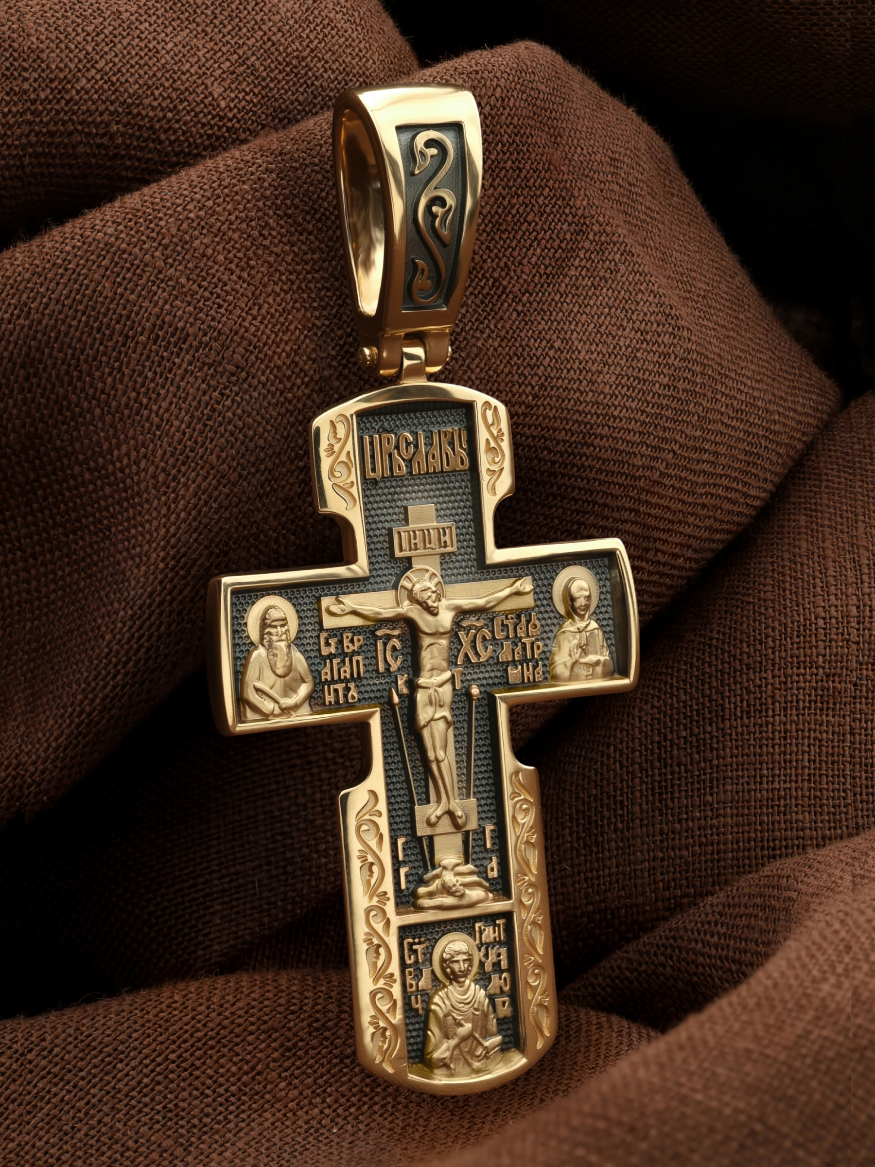 Как действенная помощь в немощах и болезнях был создан крест с образами святых целителей и со знаменитой афонской иконой Божией Матери «Всецарица». На лицевой стороне креста изображено Распятие Иисуса Христа. Над титлом видим слова «ЦРЬ СЛВЫ» — Царь Славы. Верхняя перекладина символизирует собой табличку с надписью «IHЦI» — Иисус Назарянин Царь Иудейский. Под перекладиной пишется сокращенно имя Спасителя «IC XC» — Иисус Христос. Возвышение, на котором стоит Крест, символизирует гору Голгофу, на которой произошло Распятие. У подножия Креста изображают прах Адама, обозначенный черепом. Справа от Распятия помещен образ прославленной святой блаженной Матроны. Слева — икона Преподобный Агапита. Этот святой жил в пещерах Киево-Печерского монастыря в XI веке и бескорыстно врачевал мирян и монахов. У основания Креста Господня изображен великомученик Пантелеимон Целитель. Господь даровал удивительную силу его молитве. Ею он исцелял любые болезни и даже воскрешал умерших.