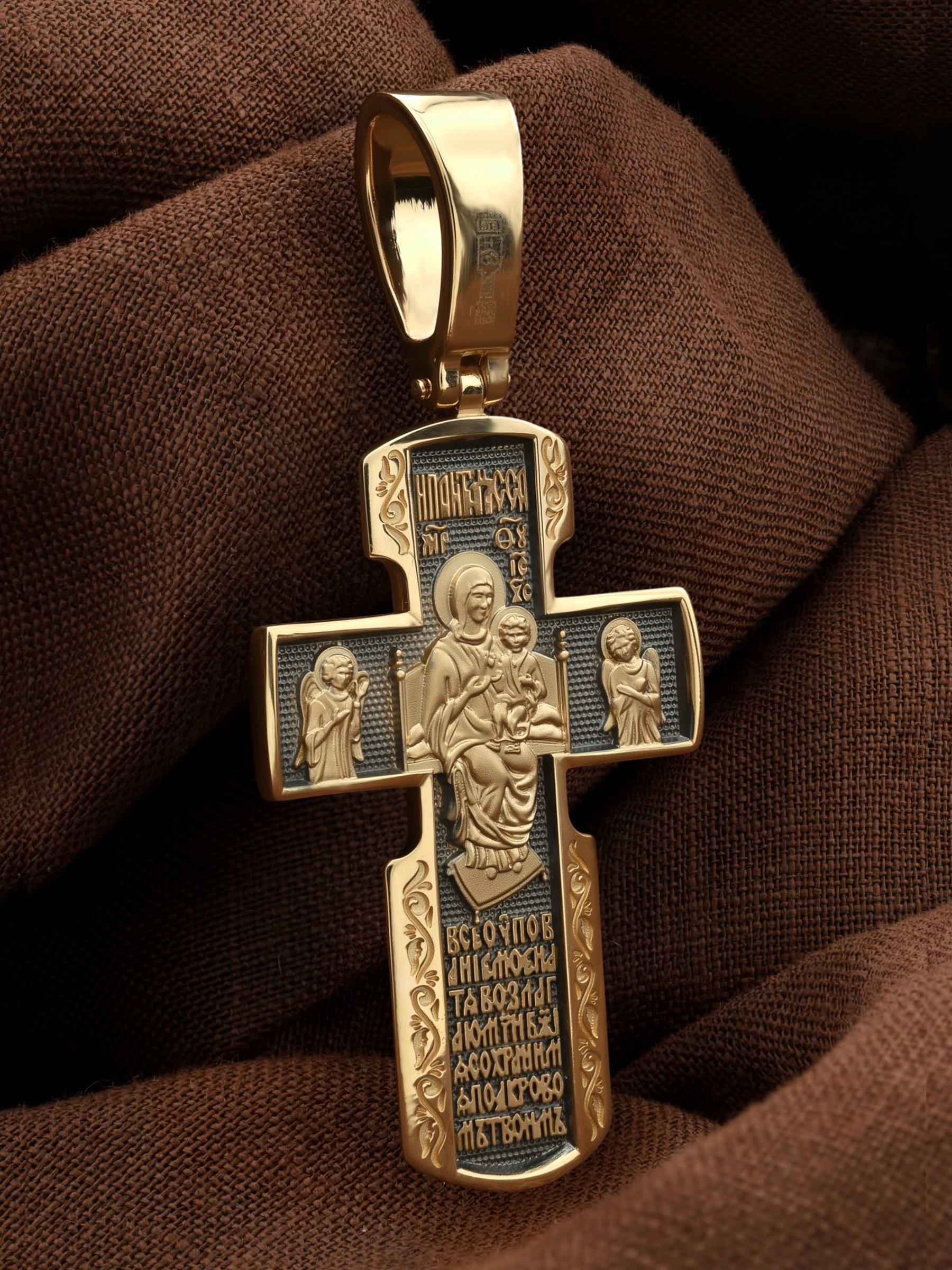 Весь оборот креста занимает икона Божией Матери «Всецарица». Внизу креста написана молитва обращенная к Божией Матери «Все упование мое на Тя возлагаю, Мати Божия, сохрани мя под кровом Твоим».
