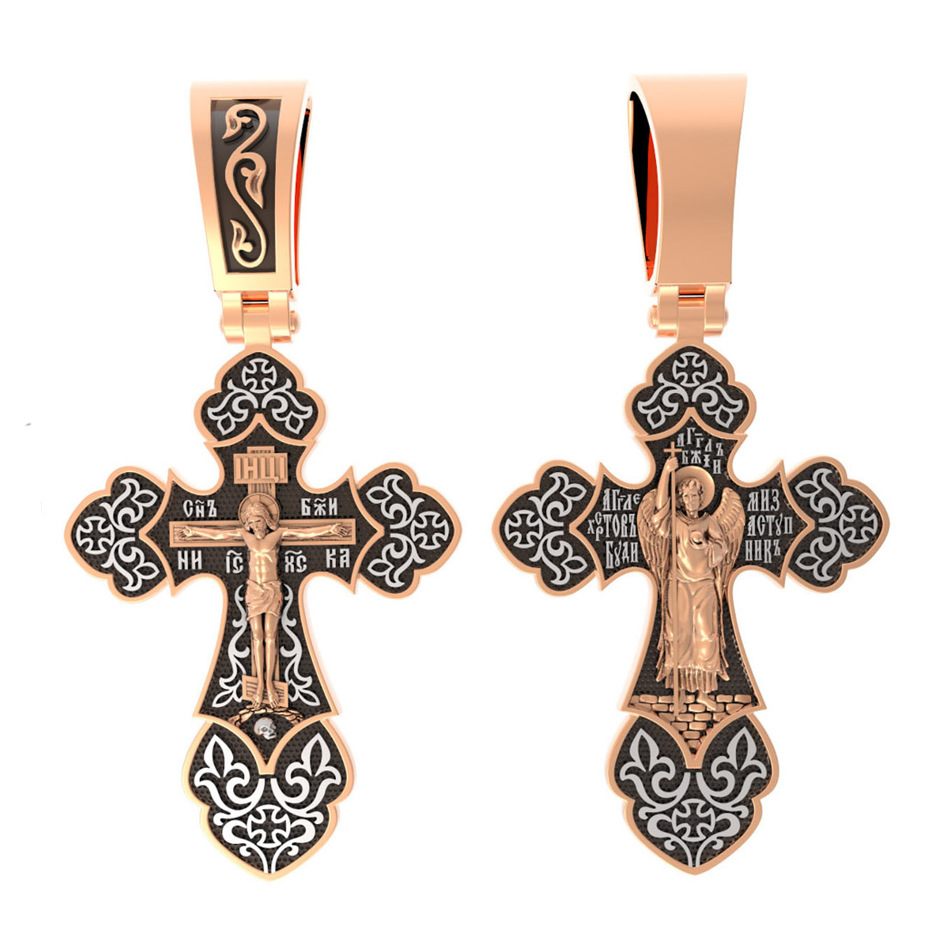 Крест с рельефным изображением Распятия в окружении пышных цветов и ажурного узора, напоминает нам о красоте Райского сада. На лицевой стороне креста изображено Распятие, потому что это орудие казни Иисус Христос сделал орудием победы над грехом и смертью. Своими страданиями Он искупил грехи человечества, умерев и сошествовав во ад, победил сатану, освободил души праведников от вечной смерти и открыл им небесные врата рая. Жертва Христа сделала возможным спасение для каждого человека. На православном кресте Христос не умирает, а свободно простирает руки, ладони Иисуса открыты, будто он хочет обнять все человечество, даря им свою любовь и открывая путь к вечной жизни. Верхняя перекладина символизирует собой табличку с надписью «IHЦI» — Иисус Назарянин Царь Иудейский. Над перекладиной пишется словосочетание «СЫН БОЖИЙ», ниже перекладины добавляется: «НИКА» (греч. — Победитель) и сокращенное имя Спасителя «IC XC» — Иисус Христос. Возвышение, на котором стоит Крест, символизирует гору Голгофу, на которой произошло Распятие. У подножия Креста изображают прах Адама, обозначенный черепом.
