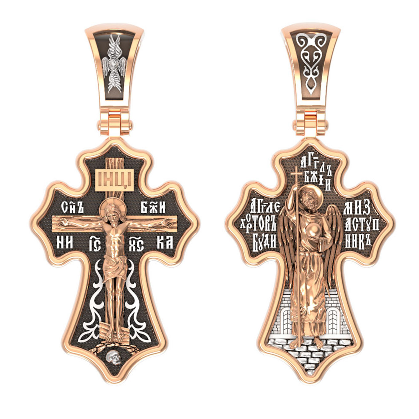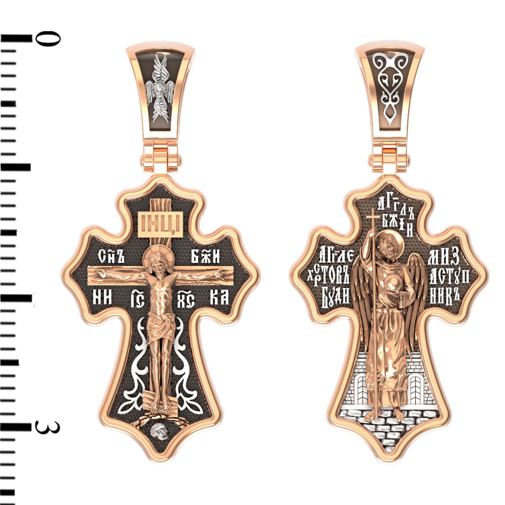 На лицевой стороне креста изображено Распятие, потому что это орудие казни Иисус Христос сделал орудием победы над грехом и смертью. Своими страданиями Он искупил грехи человечества, умерев и сошествовав во ад, победил сатану, освободил души праведников от вечной смерти и открыл им небесные врата рая. Жертва Христа сделала возможным спасение для каждого человека. На православном кресте Христос не умирает, а свободно простирает руки, ладони Иисуса открыты, будто он хочет обнять все человечество, даря им свою любовь и открывая путь к вечной жизни. Верхняя перекладина символизирует собой табличку с надписью «IHЦI» — Иисус Назарянин Царь Иудейский. Над перекладиной пишется словосочетание «СНЪ БЖIЙ» — СЫН БОЖИЙ. Ниже перекладины пишется сокращенно имя Спасителя «IC XC» — Иисус Христос и слово «НИКА» (греч. — Победитель). Возвышение, на котором стоит Крест, символизирует гору Голгофу, на которой произошло Распятие. У подножия Креста изображают прах Адама, обозначенный черепом. На кулонном кольце изображен шестикрылый Серафим — самый приближенный к Господу Ангел.