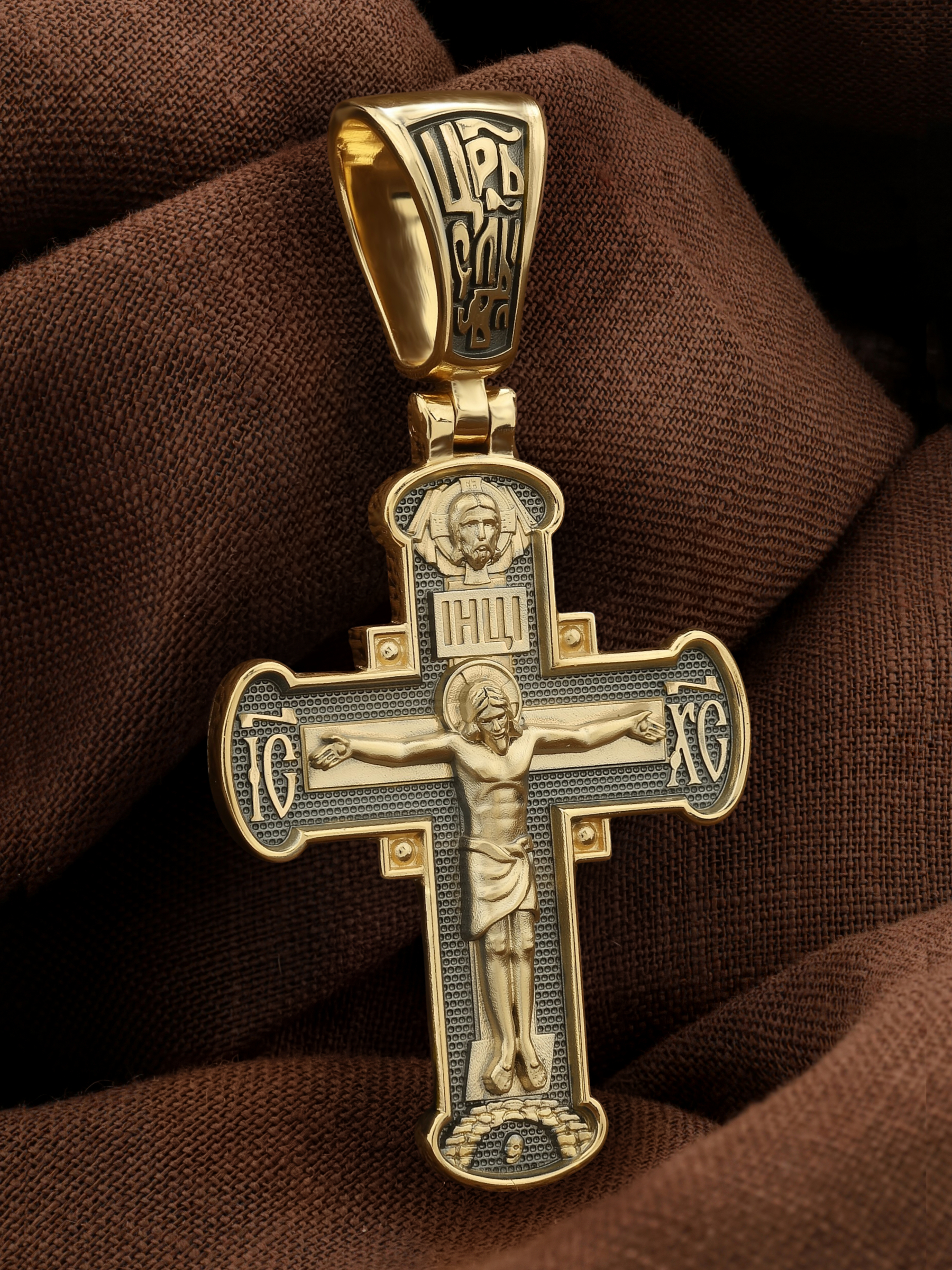 На лицевой стороне креста изображено Распятие Господа и Спасителя нашего Иисуса Христа, отдавшего Себя на смерть, для искупления грехов мира. Крест является символом жертвенной любви Всеблагого Бога к падшим людям, всепобеждающим духовным оружием христиан, основанием и средоточием церковной жизни. Господь сказал: «кто хочет идти за Мною, отвергнись себя, и возьми крест свой, и следуй за Мною». (Мк. 8: 34). На кулонном кольце помещена надпись «Царь Славы». На верхней табличке, выше головы Иисуса, расположена надпись, составленная Понтием Пилатом — «IНЦI». Она означает «Иисус Назорей, Царь Иудейский». Над ней — Нерукотворный образ Господа и Спасителя нашего Иисуса Христа, чудесно отпечатавшийся на плате, котором Христос вытер свой лик. Надпись «IC» «ХC», означает Иисус Христос, помещается на разных сторонах поперечной перекладины креста. Крест стоит на горе камней, символизирующих Голгофу. В ее основании различается череп– это голова Адама.