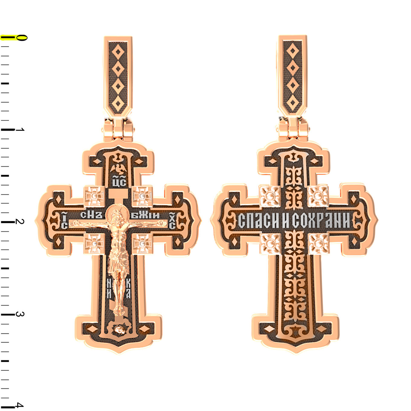 На лицевой стороне креста изображено Распятие Господа и Спасителя нашего Иисуса Христа. В Голгофе сокрыта непостижимая тайна бесконечной правды и любви Бога. Крест стал символом победы добра над злом, жизни над смертью, напоминанием бесконечной Божьей любви, предметом радости. Воплотившийся Сын Божий Своею кровью освятил крест и сделал его проводником Своей благодати, источником освящения верующих. Над вершиной Распятия помещена надпись «Царь Славы» и изображение Духа Святого в виде голубя, сходящего с небес. Надпись «IС» « ХС» означает Иисус Христос и помещается на разных сторонах поперечной перекладины креста. Рядом расположена надпись «Сын Божий». Слово «НИКА», что означает «победитель», помещаются в нижней части креста. Крест стоит на горе камней, символизирующих Голгофу. В ее основании различается череп — это голова Адама. На православном кресте Христос не умирает, а свободно простирает руки, ладони Иисуса открыты, будто он хочет обнять все человечество, даря им свою любовь и открывая путь к вечной жизни.