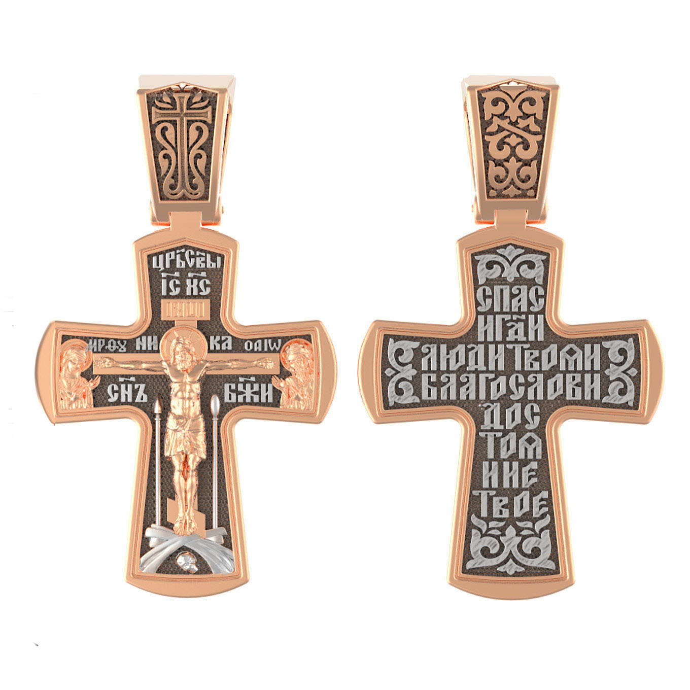 На лицевой стороне креста изображено Распятие Господа и Спасителя нашего Иисуса Христа, отдавшего Себя на смерть, для искупления грехов мира. Крест является символом жертвенной любви Всеблагого Бога к падшим людям, всепобеждающим духовным оружием христиан, основанием и средоточием церковной жизни. Господь сказал: «кто хочет идти за Мною, отвергнись себя, и возьми крест свой, и следуй за Мною». (Мк. 8: 34). На кулонном кольце изображен процветший крест. На верхней табличке, выше головы Иисуса, расположена надпись, составленная Понтием Пилатом — «IНЦI». Она означает «Иисус Назорей, Царь Иудейский». Распятие сопровождается каноническими надписями. Выше Распятия помещена надпись «Царь Славы» и надпись «IC» «ХC», означает Иисус Христос. Слово «НИКА», что означает «победитель» и надпись «Сын Божий», что означает божественную природу Иисуса Христа, помещаются на разных сторонах поперечной перекладины креста. Слева от Распятия изображена Пресвятая Богородица, справа — Про¬рок Предтеча и Креститель Господень Иоанн. Вдоль креста помещены Орудия Страстей Господних — копие сотника Лонгина и трость с губкой. Крест стоит на горе камней, символизирующих Голгофу. В ее основании различается череп– это голова Адама. На православном кресте Христос не умирает, а свободно простирает руки, ладони Иисуса открыты, будто он хочет обнять все человечество, даря им свою любовь и открывая путь к вечной жизни.