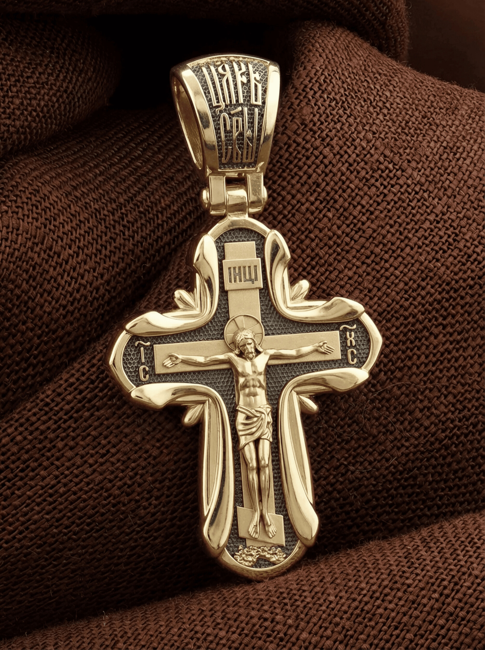 На лицевой стороне креста изображено Распятие Господа и Спасителя нашего Иисуса Христа, отдавшего Себя на смерть, для искупления грехов мира. Крест является символом жертвенной любви Всеблагого Бога к падшим людям, всепобеждающим духовным оружием христиан, основанием и средоточием церковной жизни. Господь сказал: кто хочет идти за Мною, отвергнись себя, и возьми крест свой, и следуй за Мною. (Мк. 8: 34). Над вершиной Распятия, на кулонном кольце, помещена надпись «Царь Славы». На верхней табличке, выше головы Иисуса, расположена надпись, составленная Понтием Пилатом — «IНЦI». Она означает «Иисус Назорей, Царь Иудейский». Надпись «IC» «ХC», означает Иисус Христос, помещается на разных сторонах поперечной перекладины креста. Крест стоит на горе камней, символизирующих Голгофу.