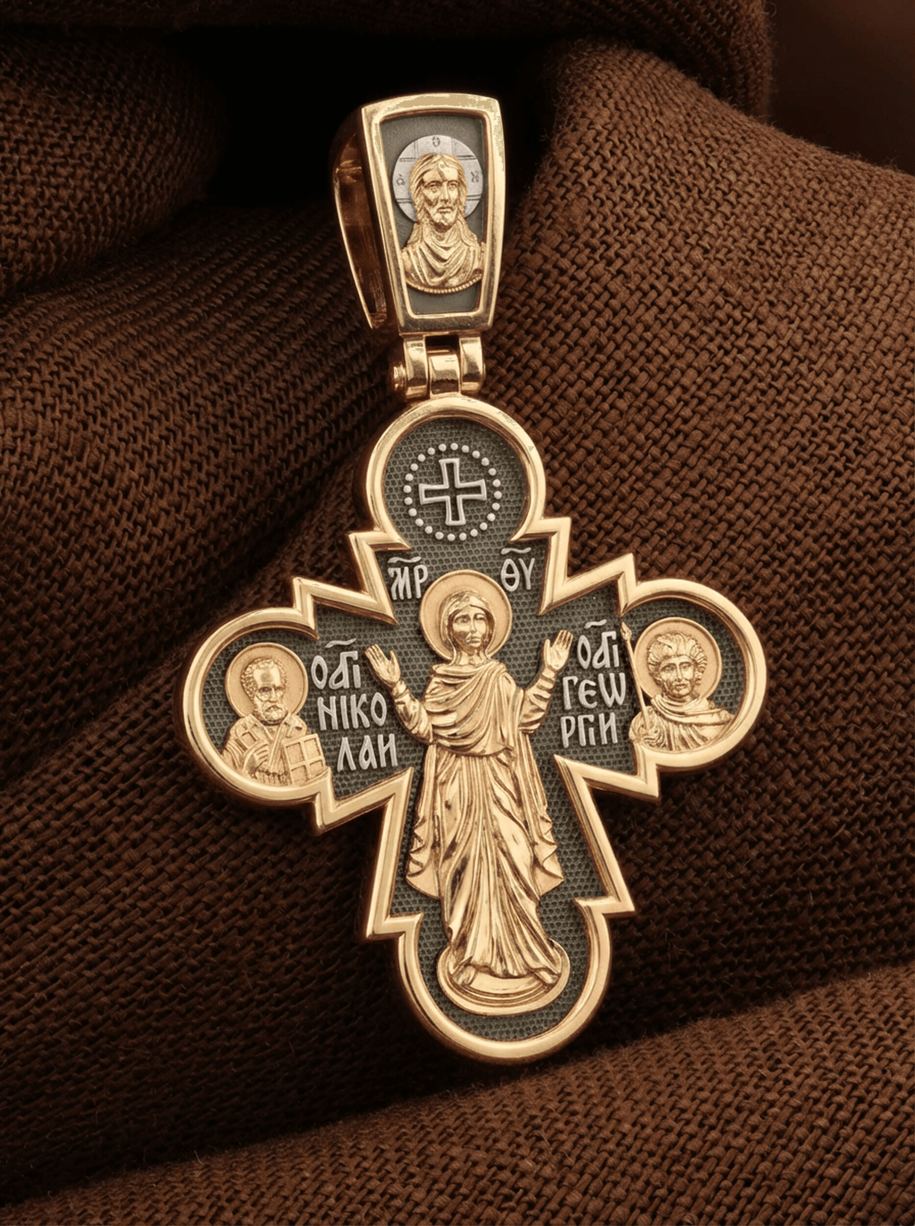 Центральную часть оборота креста занимает икона Божьей Матери «Нерушимая Стена». Особенно почитается эта икона как помощница в тяжелых жизненных ситуациях, как защитница от врагов и спасительница в смертельной опасности. Слева от Божьей Матери расположен образ Святого Николая Чудотворца. Ему молятся, отправляясь в путешествие, особенно по морю, просят исцеления в различных недугах, помощи в торговых делах, учебе и поисках достойного супруга. Справа — святой великомученик Георгий Победоносец († 303), один из наиболее почитаемых святых в Христианской Церкви. Покровитель воинов, помощник в крестьянском труде, защитник в бедах, духовный помощник в невидимой брани с силами зла. Святой Георгий, небесный защитник, который спускается с Небес, чтобы помочь душе избавиться от гибели.