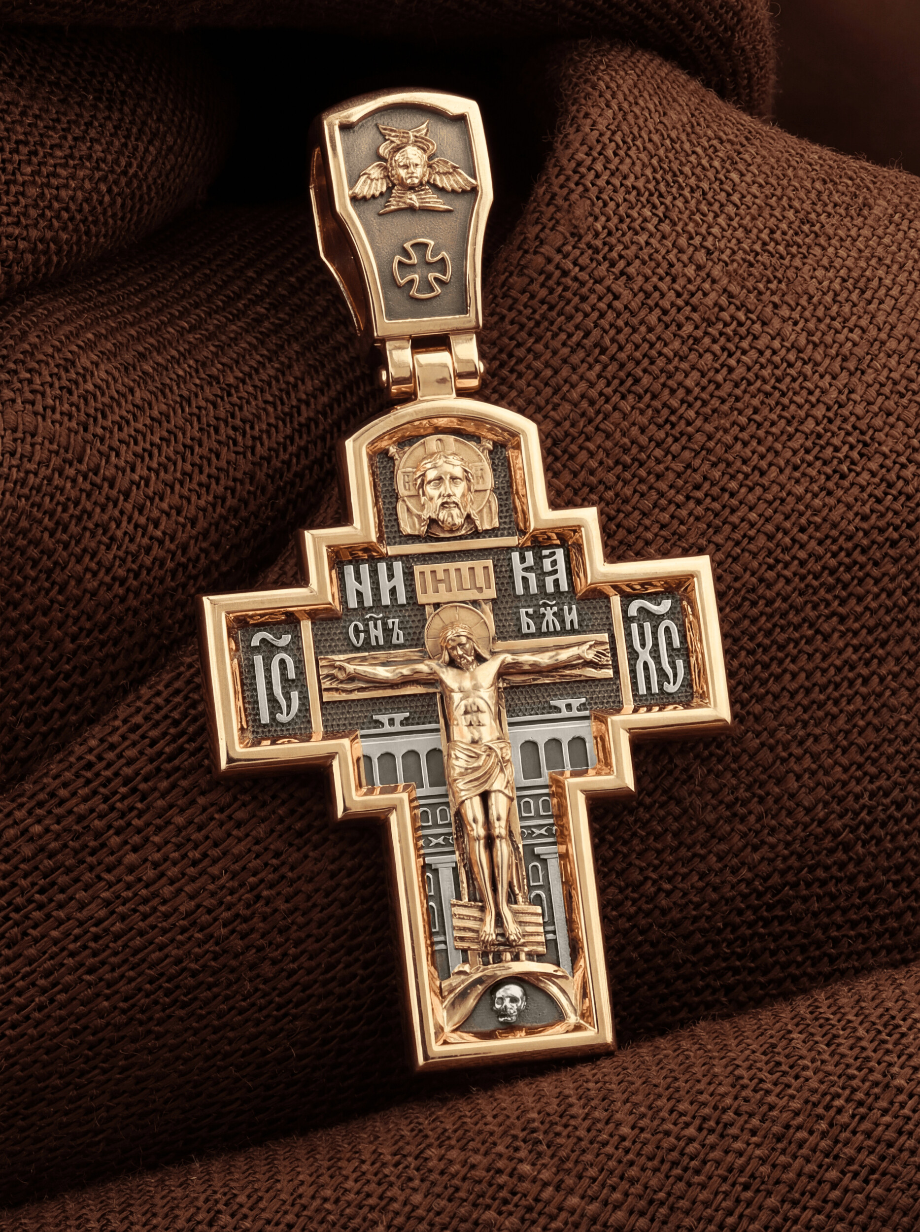 Основной композицией лицевой стороны является Распитие Господа Иисуса Христа. Позади Распятия видна иерусалимская стена, знак того, что Господь был распят вне стен города. Но вместе с тем стена символизирует и Небесный Иерусалим, путь который открылся для человека через Голгофу. У подножья Господа в виде скалистой горки видна сама Голгофа с Главой Адамовой в пещере. Распятие сопровождается каноническими надписями. Это святое имя Христа, которое принято писать на иконах сокращенно — «ИС ХС», словосочетание «СЫН БОЖИЙ», что означает божественную природу Иисуса Христа, и надпись «НИКА» — «победитель». Над Распятием помещено изображение Спаса Нерукотворного — образ Спасителя, который Он запечатлел на плате и передал для исцеления больному проказой царю Эдессы.