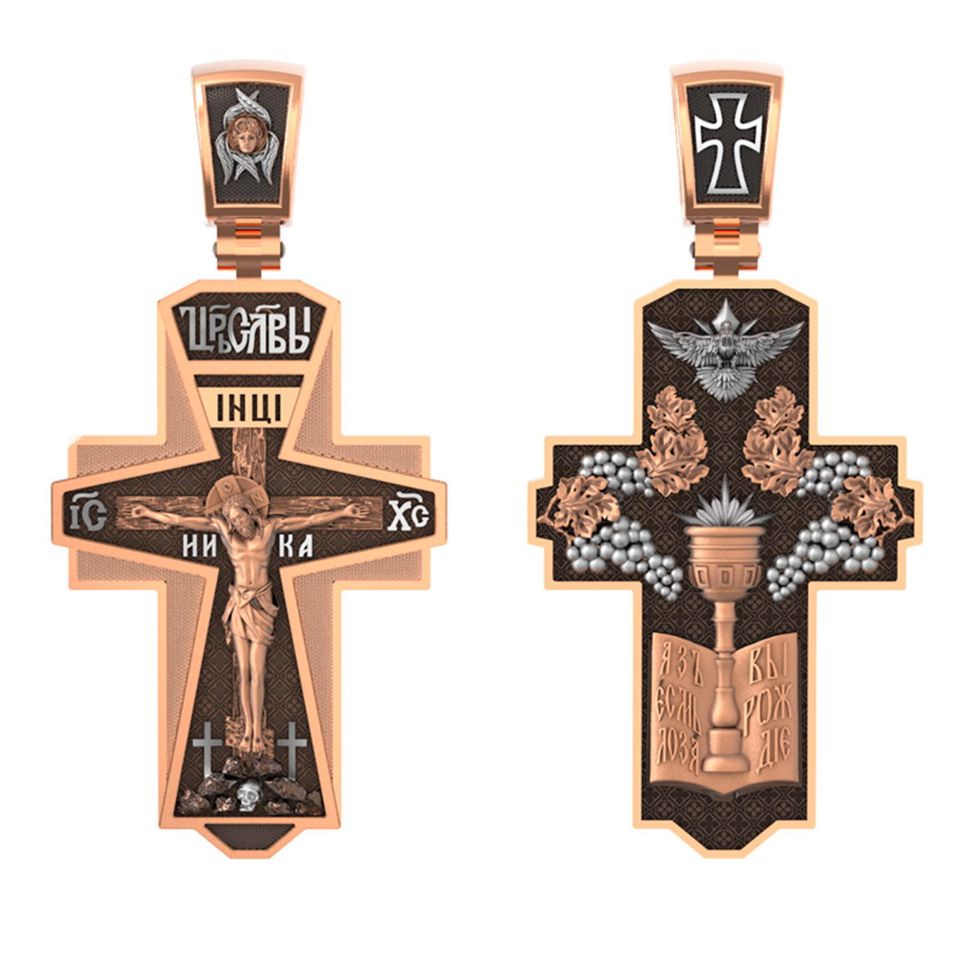 На лицевой стороне креста изображено Распятие, потому что это орудие казни Иисус Христос сделал орудием победы над грехом и смертью. Своими страданиями Он искупил грехи человечества, умерев и сошествовав во ад, победил сатану, освободил души праведников от вечной смерти и открыл им небесные врата рая. Жертва Христа сделала возможным спасение для каждого человека. На православном кресте Христос не умирает, а свободно простирает руки, ладони Иисуса открыты, будто он хочет обнять все человечество, даря им свою любовь и открывая путь к вечной жизни.