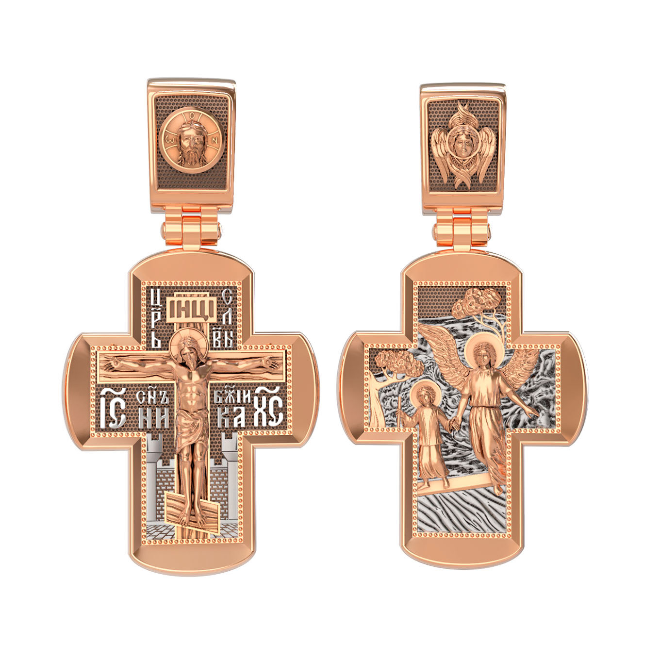 На оборотной стороне креста изображен святой Ангел-Хранитель, ведущий человеческую душу, которая представлена в виде ребёнка. Ангел-Хранитель — это Ангел приставляемый Богом к человеку при крещении для охраны и помощи в добрых делах. Он невидимо находится при человеке на протяжении всей его жизни, если человек сохраняет в себе любовь к Богу и истинную веру перед Ним. Ангел-Xранитель делают для нас все, что служит к истинному нашему благу и спасению. Невидимо пребывая при нас постоянно, он, руководствуя нас ко спасению, не только по нашему желанию таинственно наставляет нас на все доброе и полезное, не только возносит наши молитвы к Богу, но еще и сам от себя охраняют и защищают нас от врагов видимых и невидимых и ходатайствует за нас пред Богом. Одного лишь каждому из нас он желает — спасения души; к этому он направляет все свои заботы. И если видит нас также заботящимися о спасении, радуется, если же видит нас пребывающими в нерадении о душе своей, скорбит. Но и самый великий грешник может примириться со своим Ангелом-Хранителем посредством искреннего раскаяния в грехах и оставления их навсегда. В таком случае, по слову Писания, великая радость бывает для всех ангелов на небесах (Лк. 15:10). На кулонном кольце изображен Серафим.