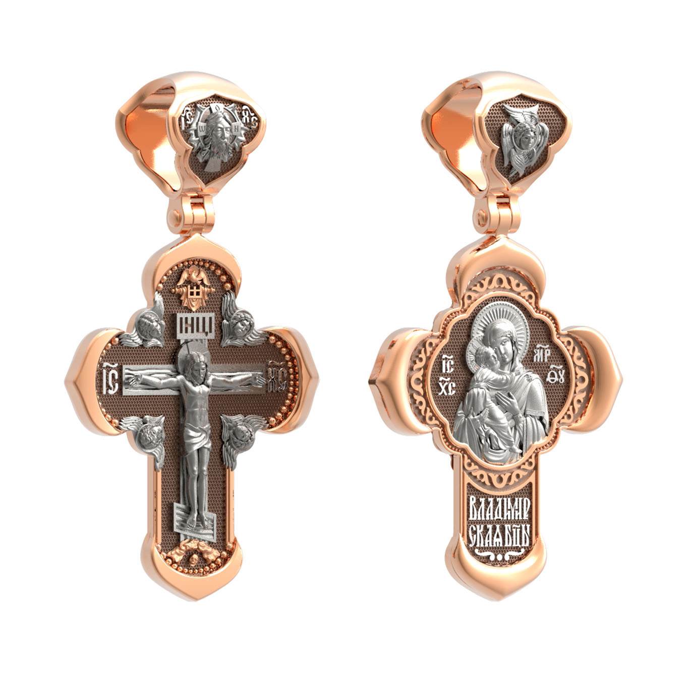 На лицевой стороне креста изображено Распятие Господа и Спасителя нашего Иисуса Христа, отдавшего Себя на смерть, для искупления грехов мира. Крест является символом жертвенной любви Всеблагого Бога к падшим людям, всепобеждающим духовным оружием христиан, основанием и средоточием церковной жизни. Господь сказал: «кто хочет идти за Мною, отвергнись себя, и возьми крест свой, и следуй за Мною». (Мк. 8: 34). На верхней табличке, выше головы Иисуса, расположена надпись, составленная Понтием Пилатом — «IНЦI». Она означает «Иисус Назорей, Царь Иудейский». Надпись «IC» «ХC», означает Иисус Христос, помещается на разных сторонах поперечной перекладины креста. Крест стоит на горе камней, символизирующих Голгофу. В ее основании различается череп– это голова Адама. На кулонном кольце изображен Нерукотворный образ Господа и Спасителя нашего Иисуса Христа, чудесно отпечатавшийся на плате, которым Христос вытер свой лик.