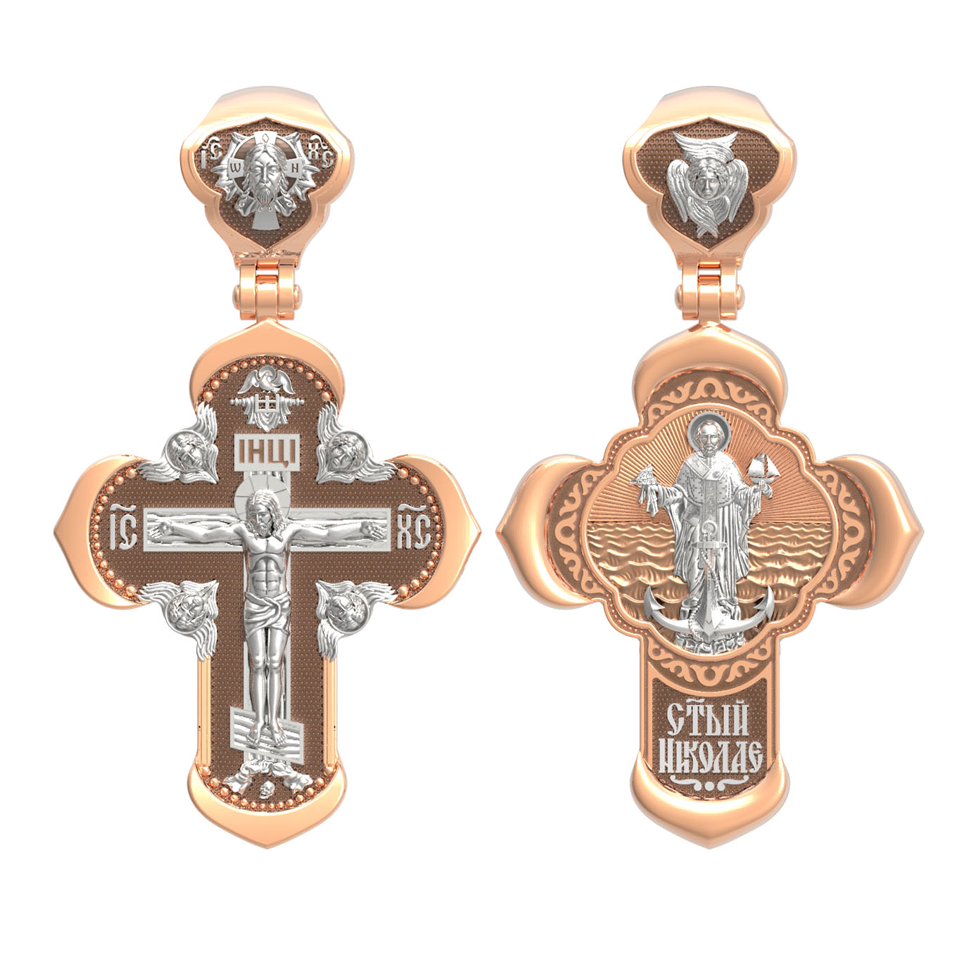 На лицевой стороне креста изображено Распятие Господа и Спасителя нашего Иисуса Христа, отдавшего Себя на смерть, для искупления грехов мира. Крест является символом жертвенной любви Всеблагого Бога к падшим людям, всепобеждающим духовным оружием христиан, основанием и средоточием церковной жизни. Господь сказал: «кто хочет идти за Мною, отвергнись себя, и возьми крест свой, и следуй за Мною». (Мк. 8: 34). На верхней табличке, выше головы Иисуса, расположена надпись, составленная Понтием Пилатом — «IНЦI». Она означает «Иисус Назорей, Царь Иудейский». Надпись «IC» «ХC», означает Иисус Христос, помещается на разных сторонах поперечной перекладины креста. Крест стоит на горе камней, символизирующих Голгофу. В ее основании различается череп– это голова Адама. На кулонном кольце изображен Нерукотворный образ Господа и Спасителя нашего Иисуса Христа, чудесно отпечатавшийся на плате, которым Христос вытер свой лик.