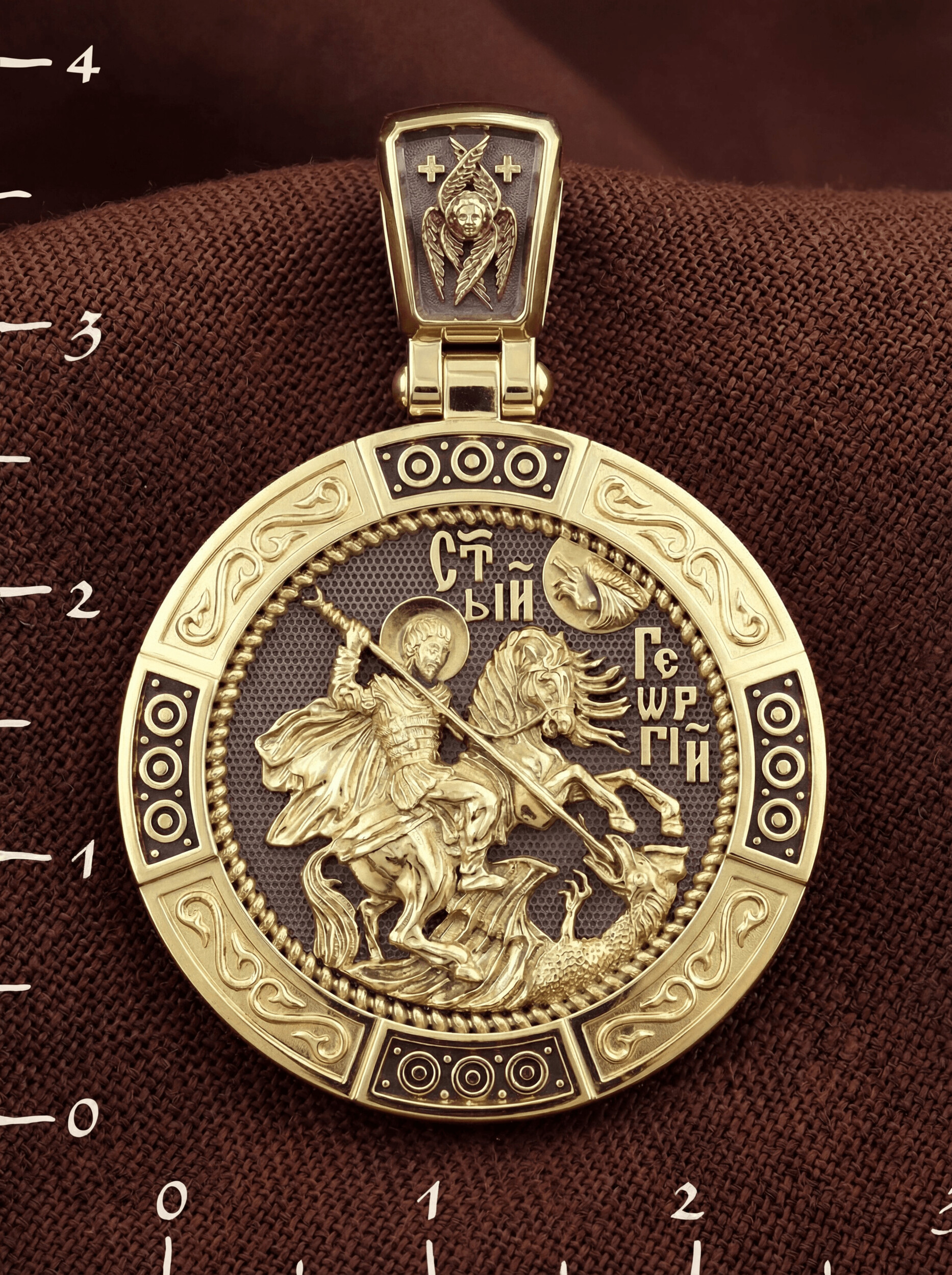 На лицевой стороне изображен Святой Георгий Победоносец. Образ Великомученика считают одним из наиболее чтимых святынь в Святыни Православных, он олицетворяет собой заступника для верующих, чья жизнь имеет какое-либо отношение к военным делам, также он может оберегать и землевладельцев. Одно из самых великих чудес, которое сотворил Великомученик — это спасения всего города от устрашающего змия. Молитвами и своей непреклонной верой, взываемой к Всевышнему, он смог одолеть чудовище. Святой убил змея, спас жителей и их души от влияния дьявола, породив в них надежду и веру в Господа, призывая людей принять христианскую веру. Поскольку при жизни св. Георгий был военным, он считается покровителем всех, кто имеет отношение к армии — военнослужащим, участникам боевых действий. Молитва перед иконой Георгия Победоносца поможет защититься от врагов, одержать победу в сражении (военном, спортивном, духовной брани с дьяволом), содействие в установлении мира между членами семьи, избавиться от телесного недуга. На кулонном кольце изображен шестикрылый Серафим — самый приближенный к Господу Ангел.