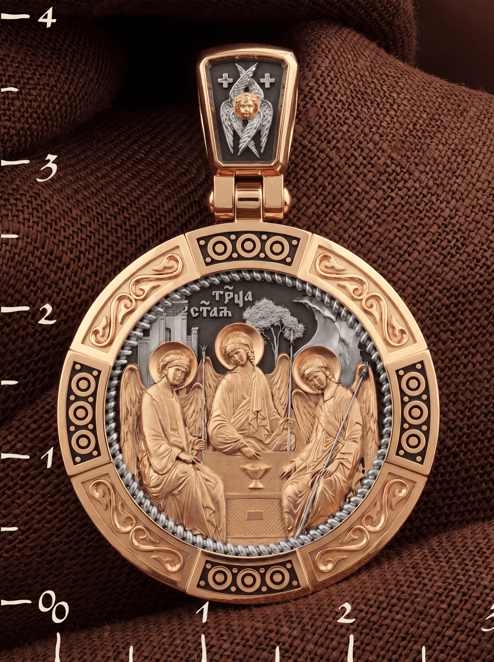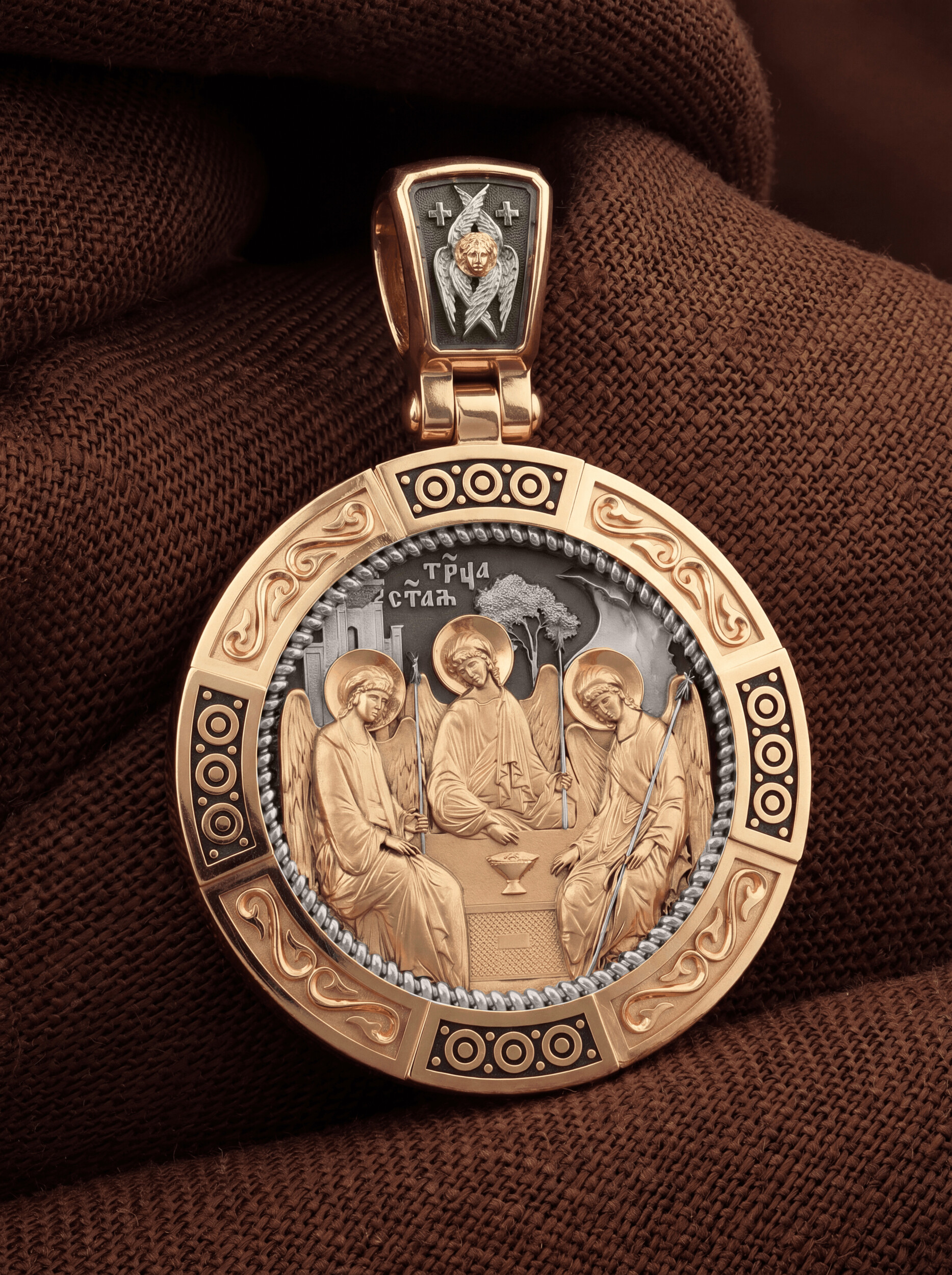 На лицевой стороне изображена икона Святой Троицы. Это образ Триединого Бога явившегося в виде трех Ангелов праотцу Аврааму. Ангелы сидят за трапезным столом вокруг чаши, которая символизирует грядущую жертву Второго Лица Пресвятой Троицы, Бога Сына.