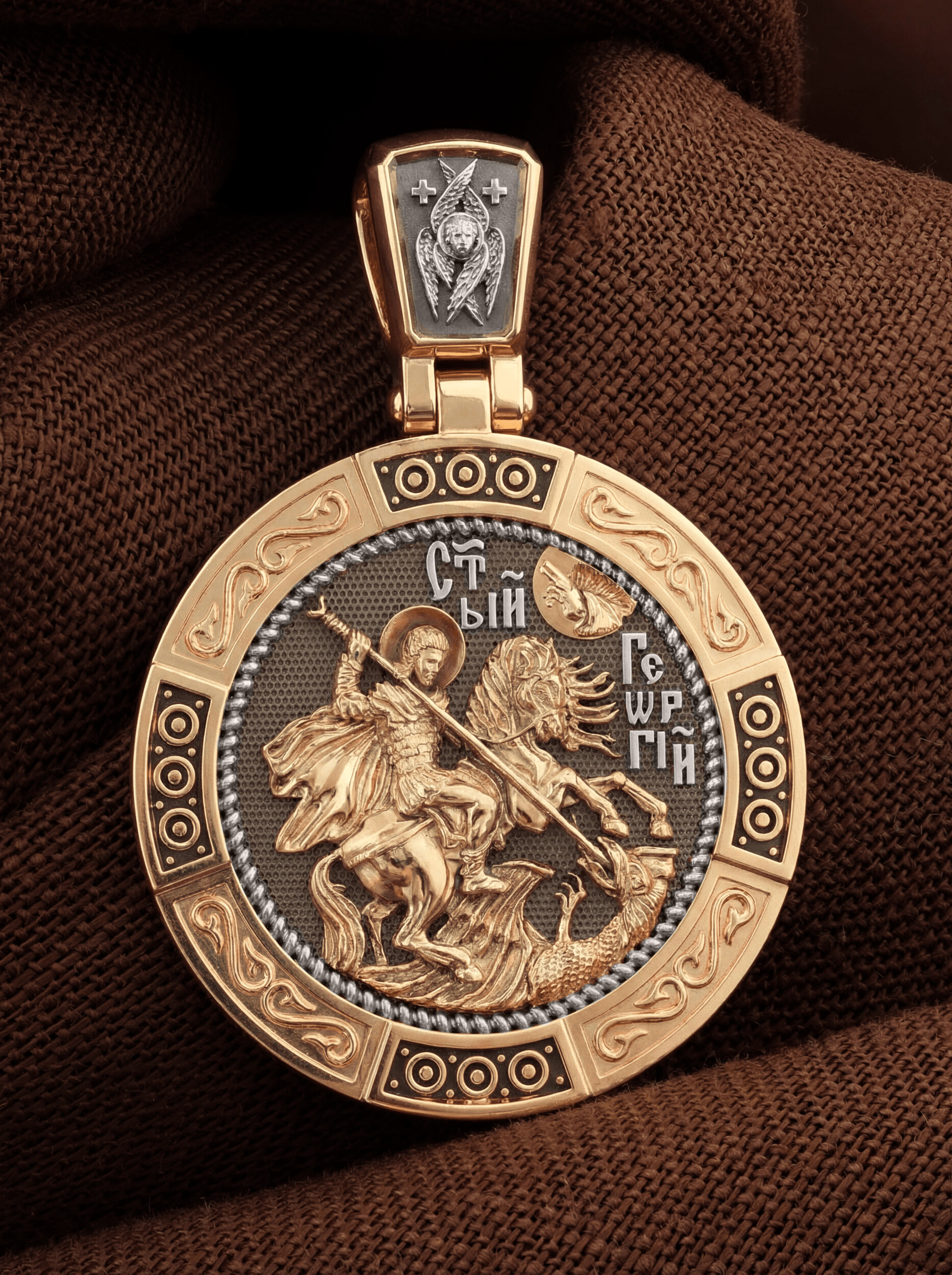 На лицевой стороне изображен Святой Георгий Победоносец. Образ Великомученика считают одним из наиболее чтимых святынь в Святыни Православных, он олицетворяет собой заступника для верующих, чья жизнь имеет какое-либо отношение к военным делам, также он может оберегать и землевладельцев. Одно из самых великих чудес, которое сотворил Великомученик — это спасения всего города от устрашающего змия. Молитвами и своей непреклонной верой, взываемой к Всевышнему, он смог одолеть чудовище. Святой убил змея, спас жителей и их души от влияния дьявола, породив в них надежду и веру в Господа, призывая людей принять христианскую веру. Поскольку при жизни св. Георгий был военным, он считается покровителем всех, кто имеет отношение к армии — военнослужащим, участникам боевых действий. Молитва перед иконой Георгия Победоносца поможет защититься от врагов, одержать победу в сражении (военном, спортивном, духовной брани с дьяволом), содействие в установлении мира между членами семьи, избавиться от телесного недуга. На кулонном кольце изображен шестикрылый Серафим — самый приближенный к Господу Ангел.
