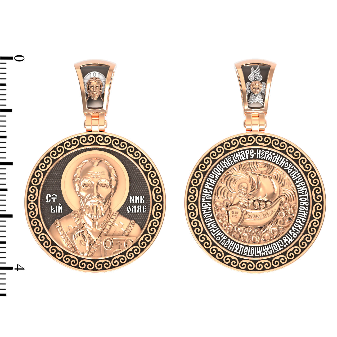 Лицевую сторону возглавляет икона Святителя Николая Чудотворца. Живший в III веке епископ Ликийского города Миры — самый почитаемый святой не только в России, но и во всем мире. Николай Чудотворец, помощник в делах, покровитель учащихся, утешитель обиженных и нуждающихся, целитель самых страшных и тяжелых недугов, предстатель и молитвенник за людей перед Богом. Также Святитель Николай Чудотворец известен своими молитвами за путешественников, когда непрестанный ветер и бушующие волны утихают и корабль заходит в спокойную гавань.
