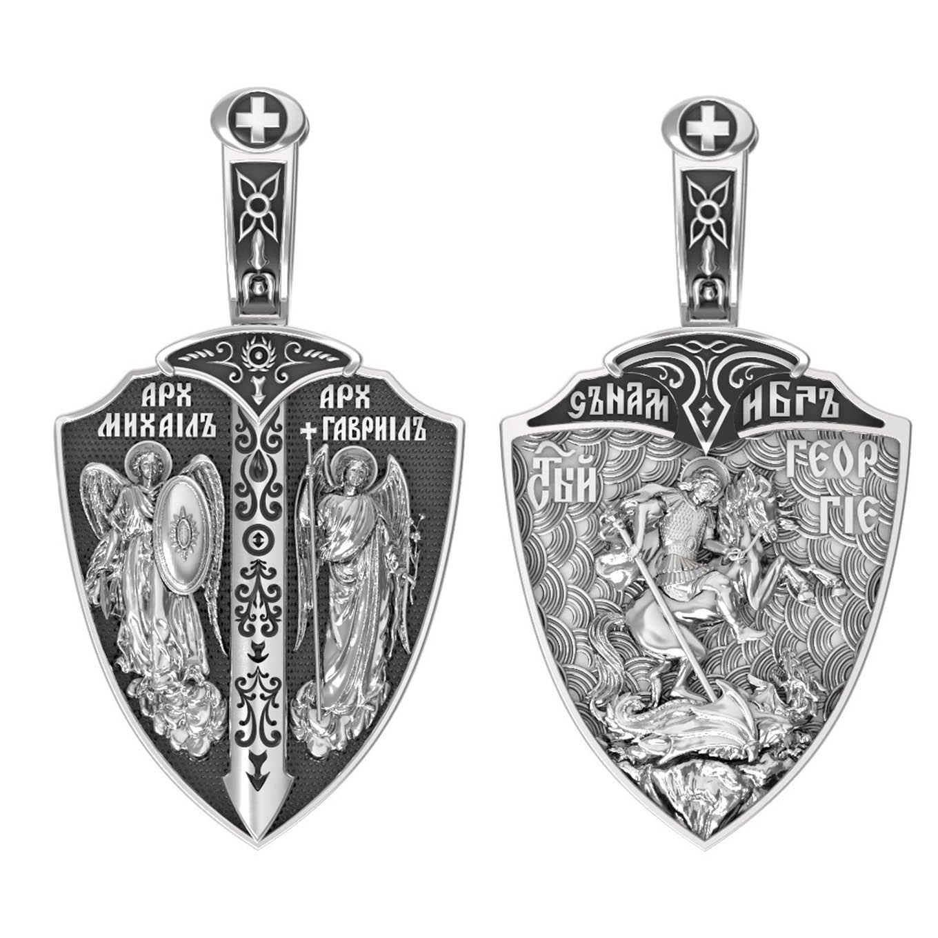 Основой композиции оборотной стороны является изображение Святого Георгия Победоносца. Святой Георгий один из наиболее почитаемых святых в Христианской Церкви. На Руси он известен как Юрий или Егорий, покровитель воинов. На образке изображено самое знаменитое чудо святого: спасение принцессы от змея, которому она предназначалась в жертву. Чудо это имеет символическое толкование. Принцесса означает душу человеческую, а змей — дьявола, желающего ее поглотить. Святой Георгий, небесный защитник, спускается с Небес, чтобы помочь душе избавиться от гибели. Образ святого воина венчают слова: «С нами Бог!». Они написаны у рукоятки меча, узорчатый клинок которого разделяет образок на две части. Сам образок имеет форму щита. Щит и меч — это символы духовной брани с дьяволом.