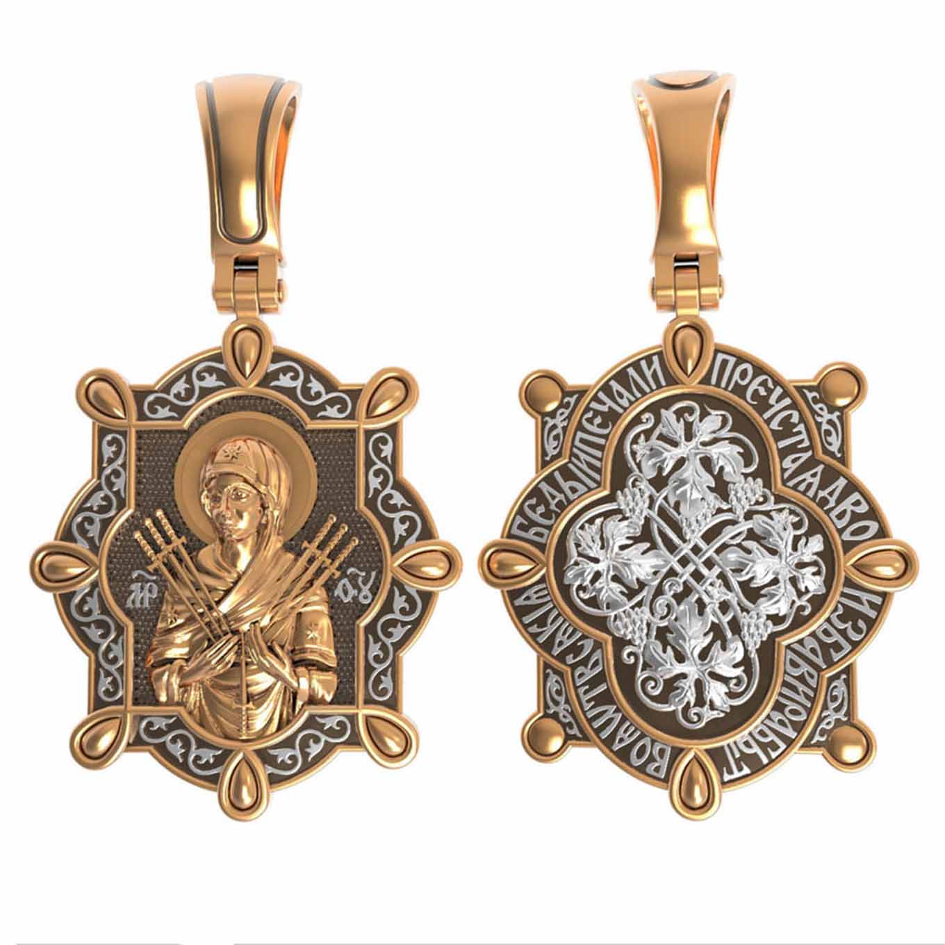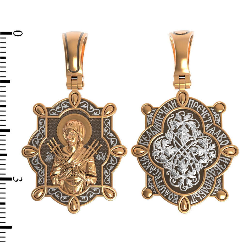 На лицевой стороне образка изображена икона Пресвятой Богородицы «Семистрельная» — одна из самых чудотворных икон на Руси. На протяжении многих веков христиане взывали к Царице Небесной через эту икону, если в стране начинались войны или мятежи.