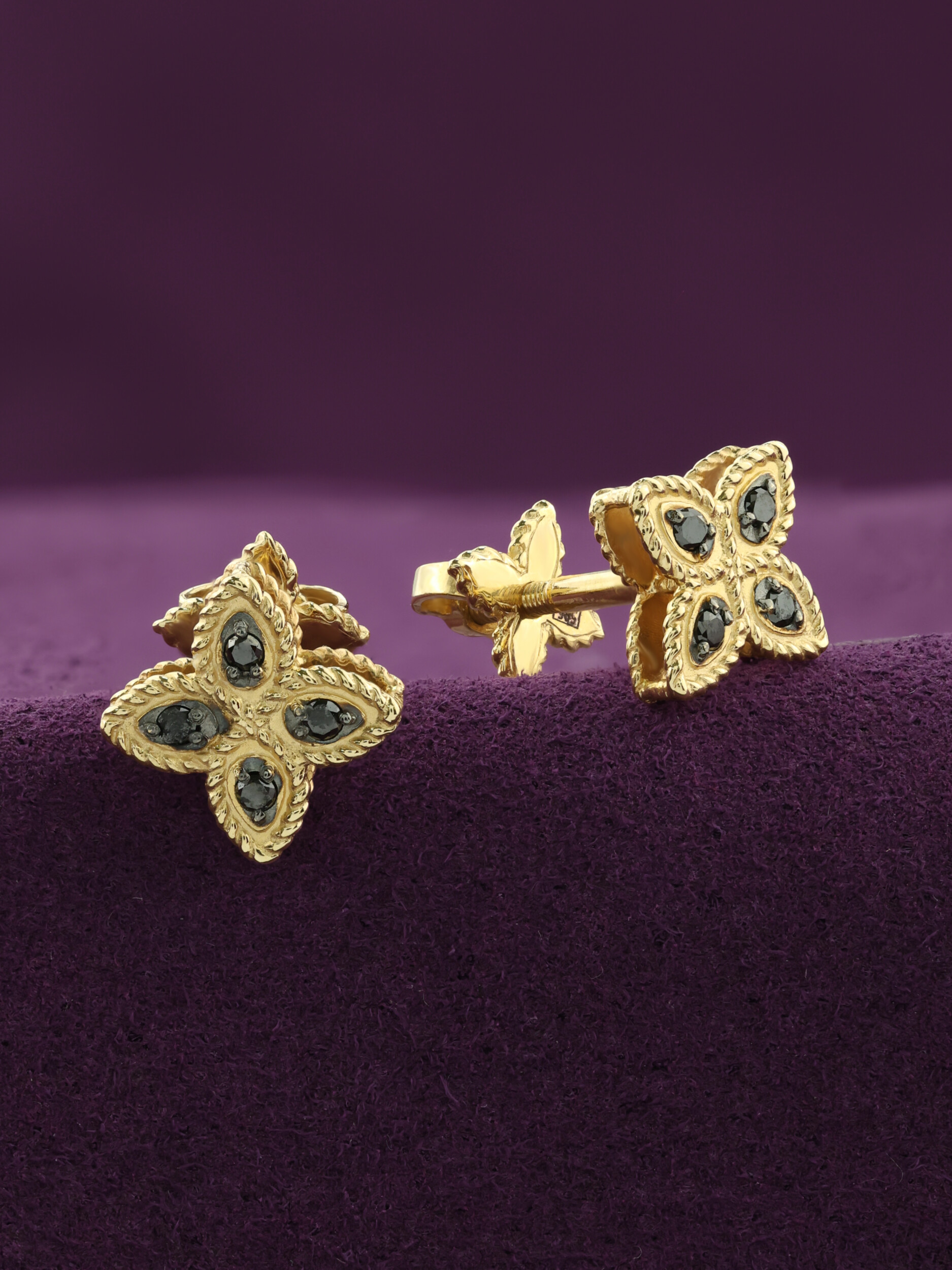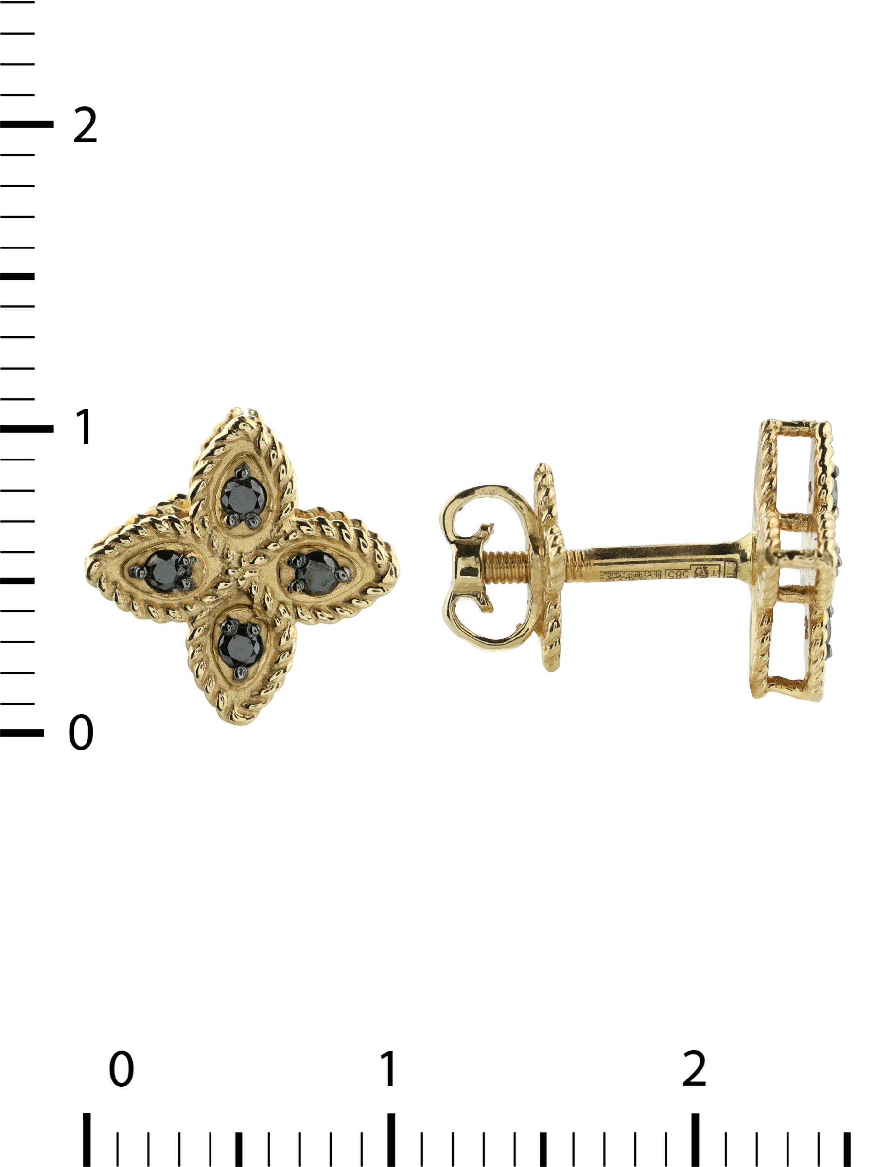 Особую выразительность этим серьгам придает контрастная вставка. В каждом изделии расположено по четыре черных бриллианта круглой огранки, что в сумме составляет 8 драгоценных камней. Черный цвет вставок эффектно подчеркивает сияние металла, создавая притягательную игру света и тени. Такая палитра делает аксессуар универсальным и глубоким.
