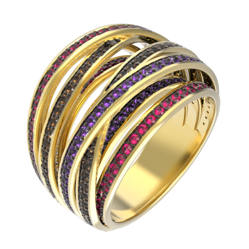 Дизайн модели акцентирован инкрустацией, состоящей из 262 фианитов круглой формы. Яркие красные вставки создают роскошный цветовой контраст с благородным лимонным оттенком металла, добавляя изделию глубину и игру света. Благодаря универсальному дизайну, такое кольцо подойдет как для женщин, так и для мужчин, предпочитающих статусные и необычные аксессуары.
