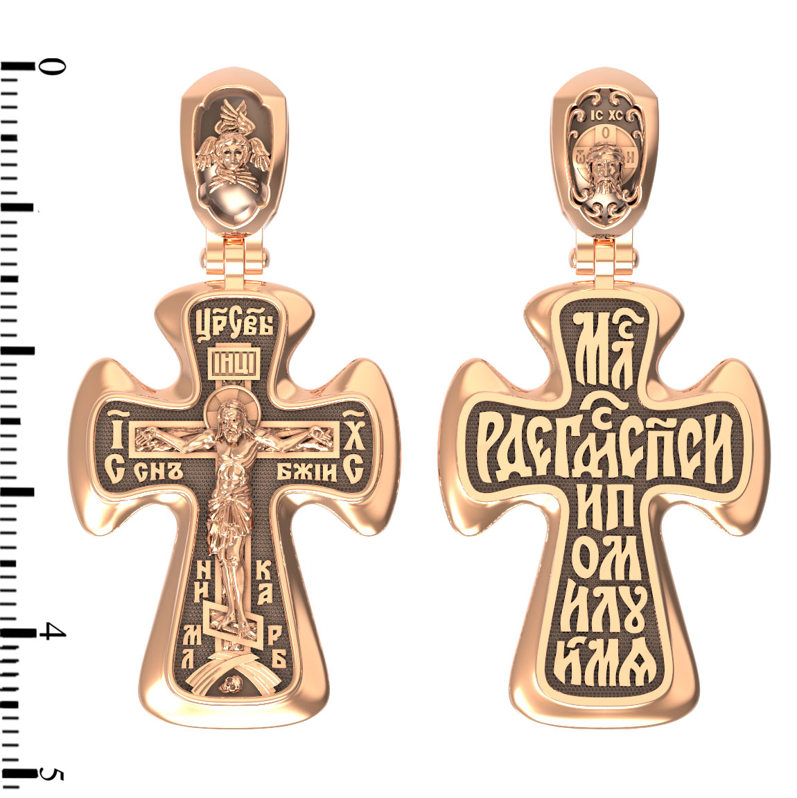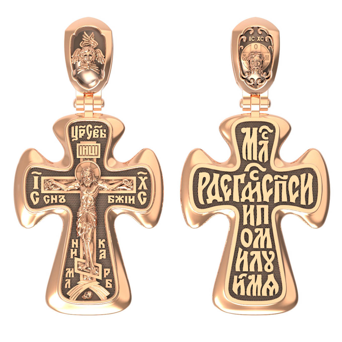 На лицевой стороне креста изображено Распятие Иисуса Христа. Господь представлен свободно покоящимся на кресте с простертыми руками и как бы обнимающим всю Вселенную. Он — Спаситель, искупивший грехи мира, «поправший смертию смерть» и призывающий к Себе «все концы земли». Поэтому рядом с Его образом помещены слова — «НИКА» и «Царь Славы». Эти слова характеризуют Господа как Великого Архиерея, победителя смерти. Также Распятие сопровождается надписями, олицетворяющими Христа. Это святое имя Христа «IC» (Иисус) «ХС» (Христос), и словосочетание «СЫН БОЖИЙ».
