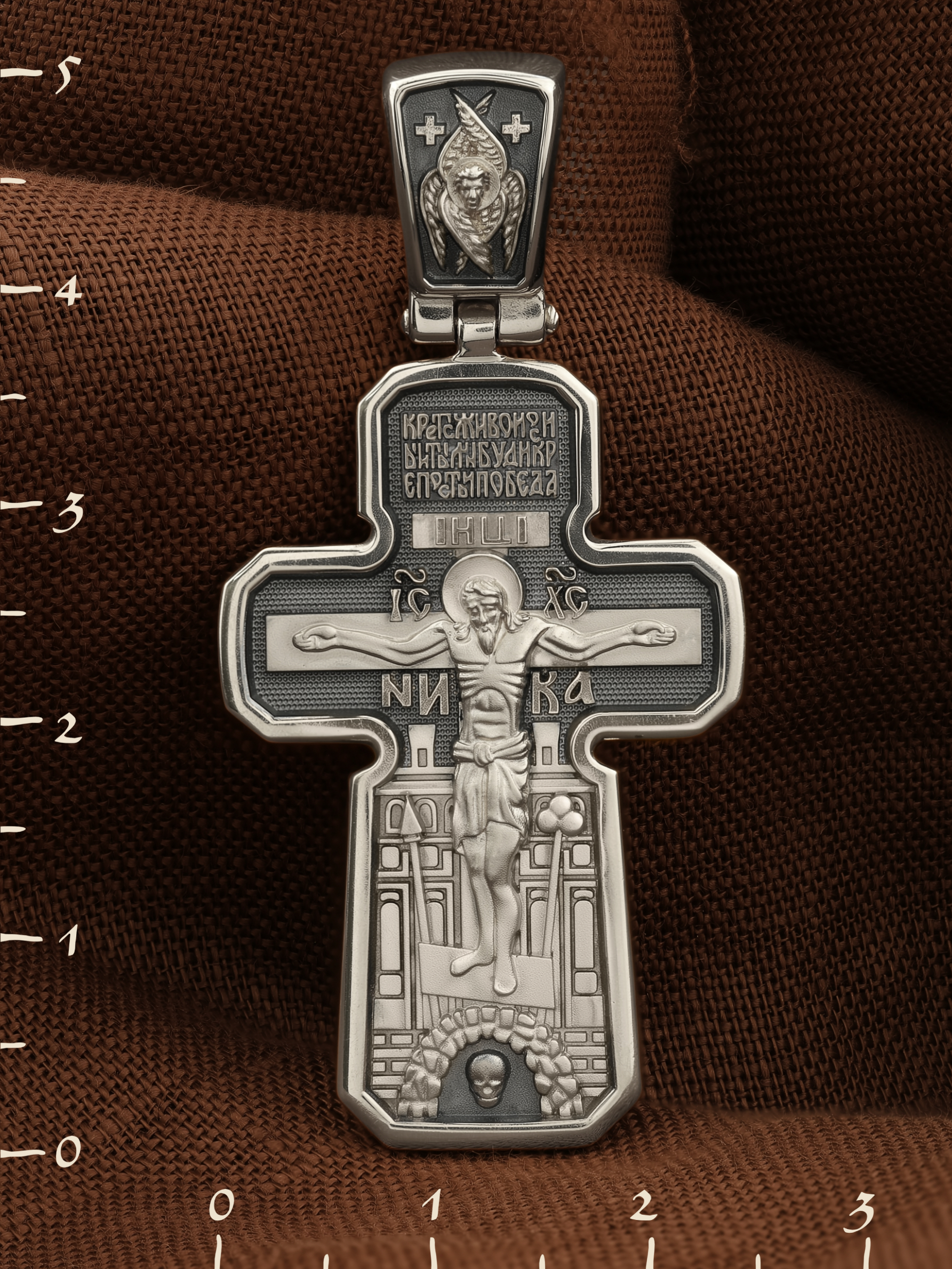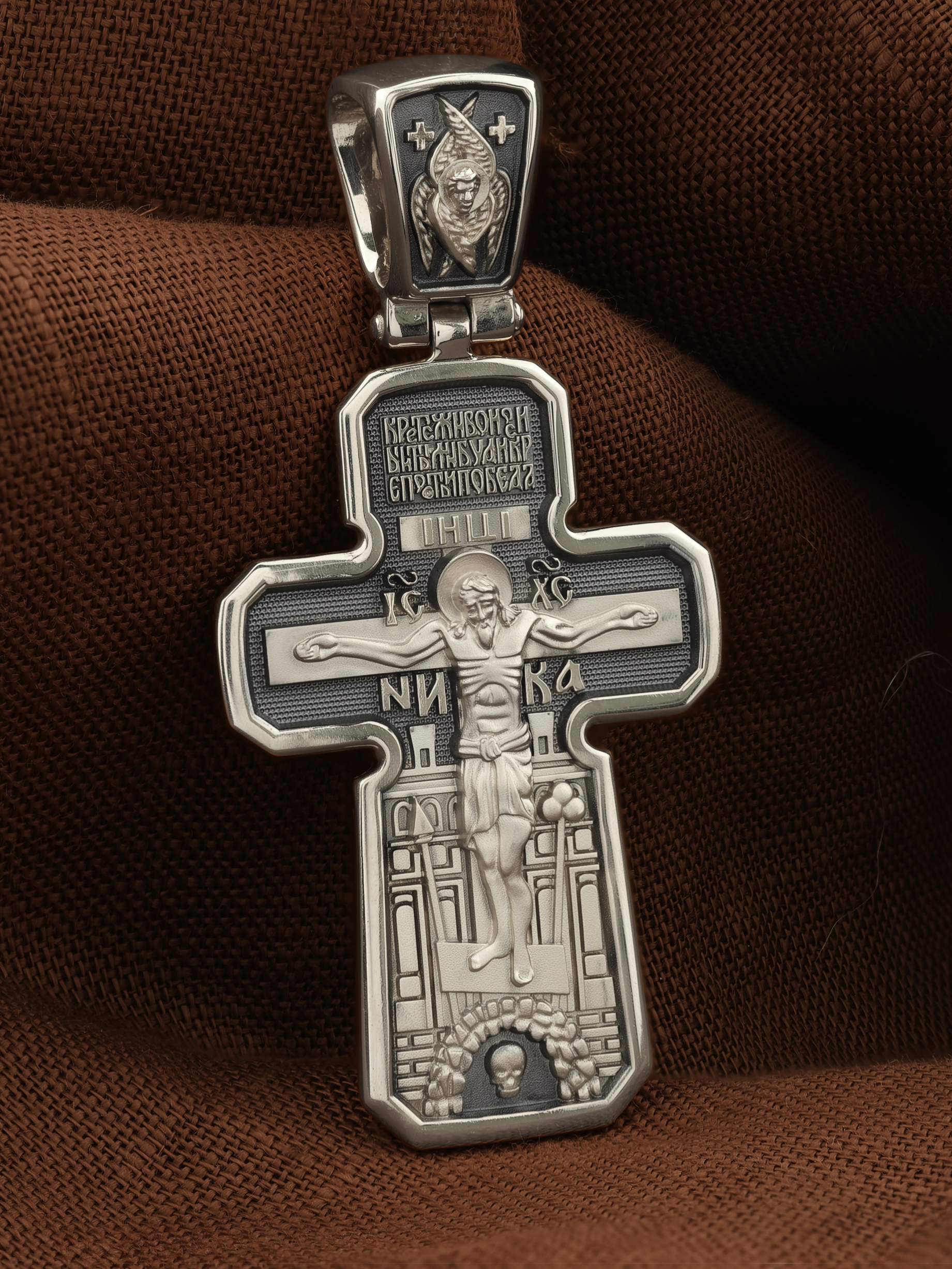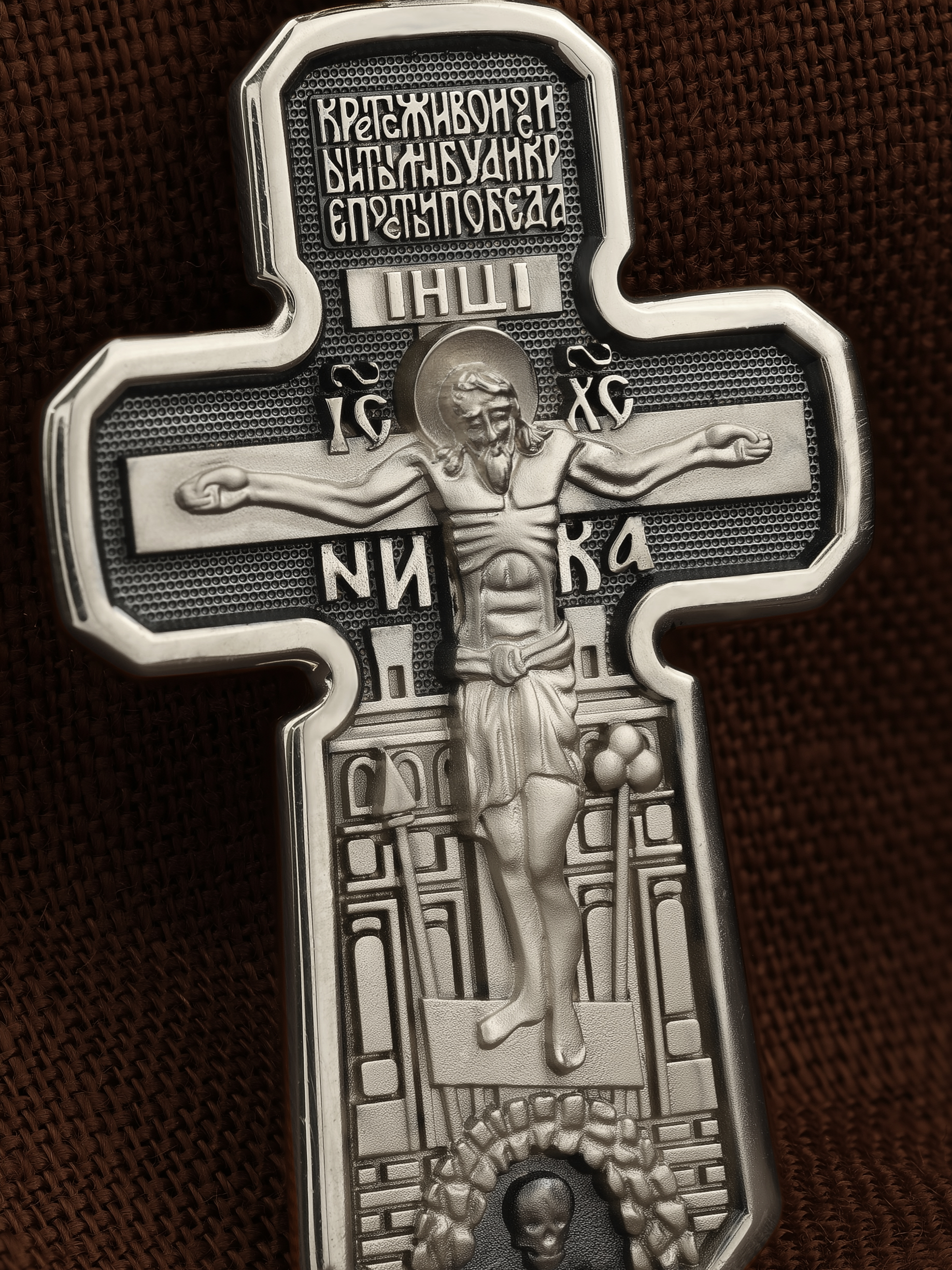 Позади Распятия видна иерусалимская стена, знак того, что Господь был распят вне стен города. Но вместе с тем стена символизирует и Небесный Иерусалим, путь который открылся для человека через Голгофу. Сам образ Распятия сопровождается каноническими надписями — инициалы Христа «IС ХС» и надпись «НИКА» (Победитель).