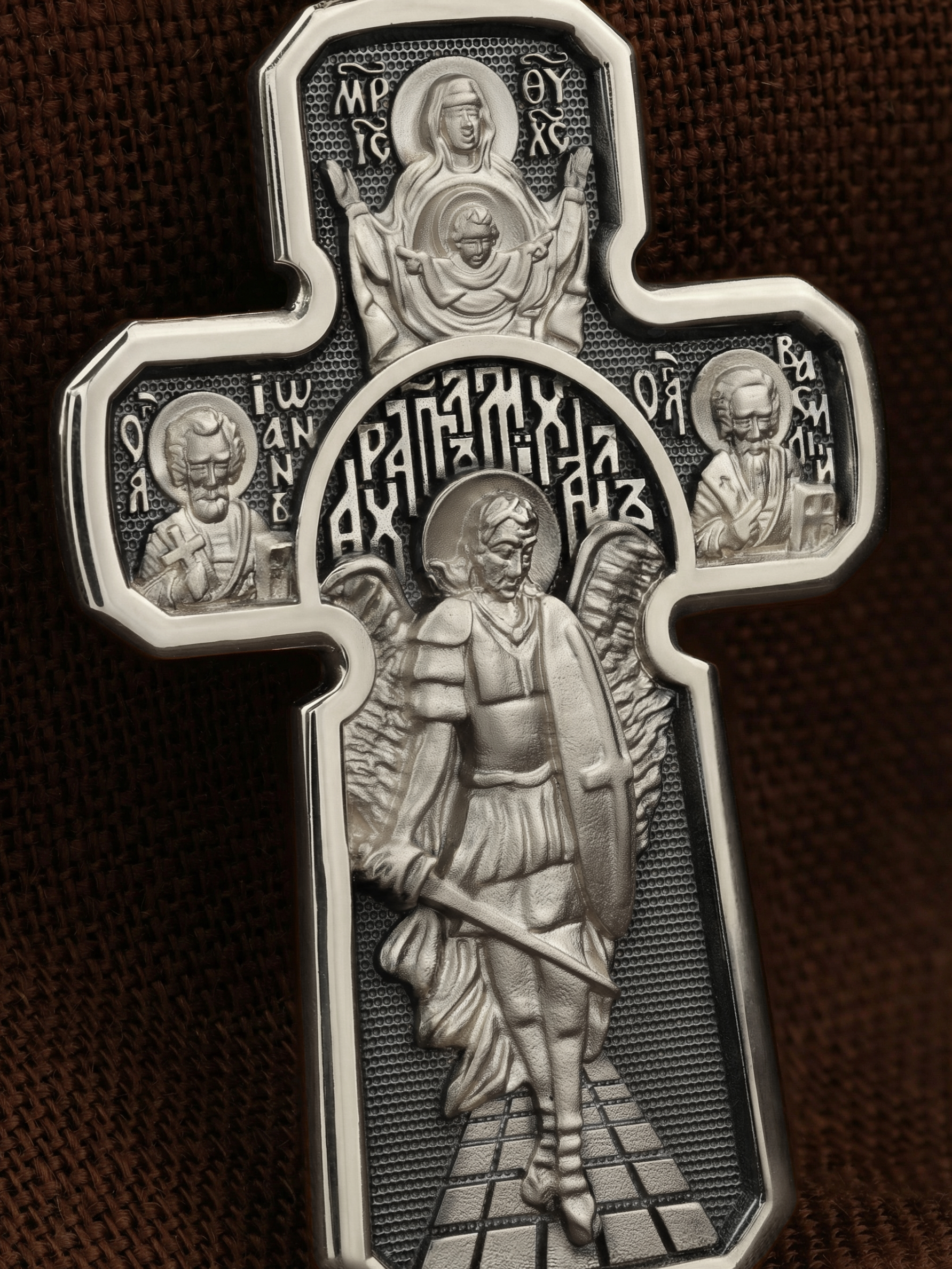 Основой композиции оборотной стороны является ростовое изображение Архангела Михаила — Архистратига всех Небесных Воинств. Он ведет непримиримую войну против сил зла, охраняет райские врата и защищает души людей. Крылатый Архангел изображен в воинском доспехе и плаще идущим по каменистой дороге. В правой руке он держит обнаженный меч, а в левой щит. С двух сторон Архангелу предстоят образы святителей Иоанна Златоуста (составитель Божественной Литургии) и Василия Великого (Вселенский учитель и один из отцов Церкви).