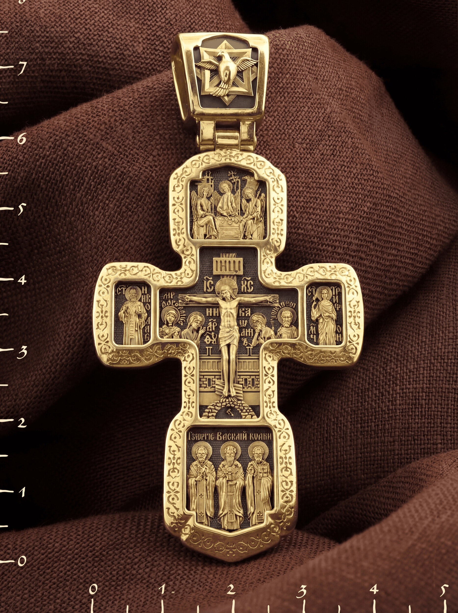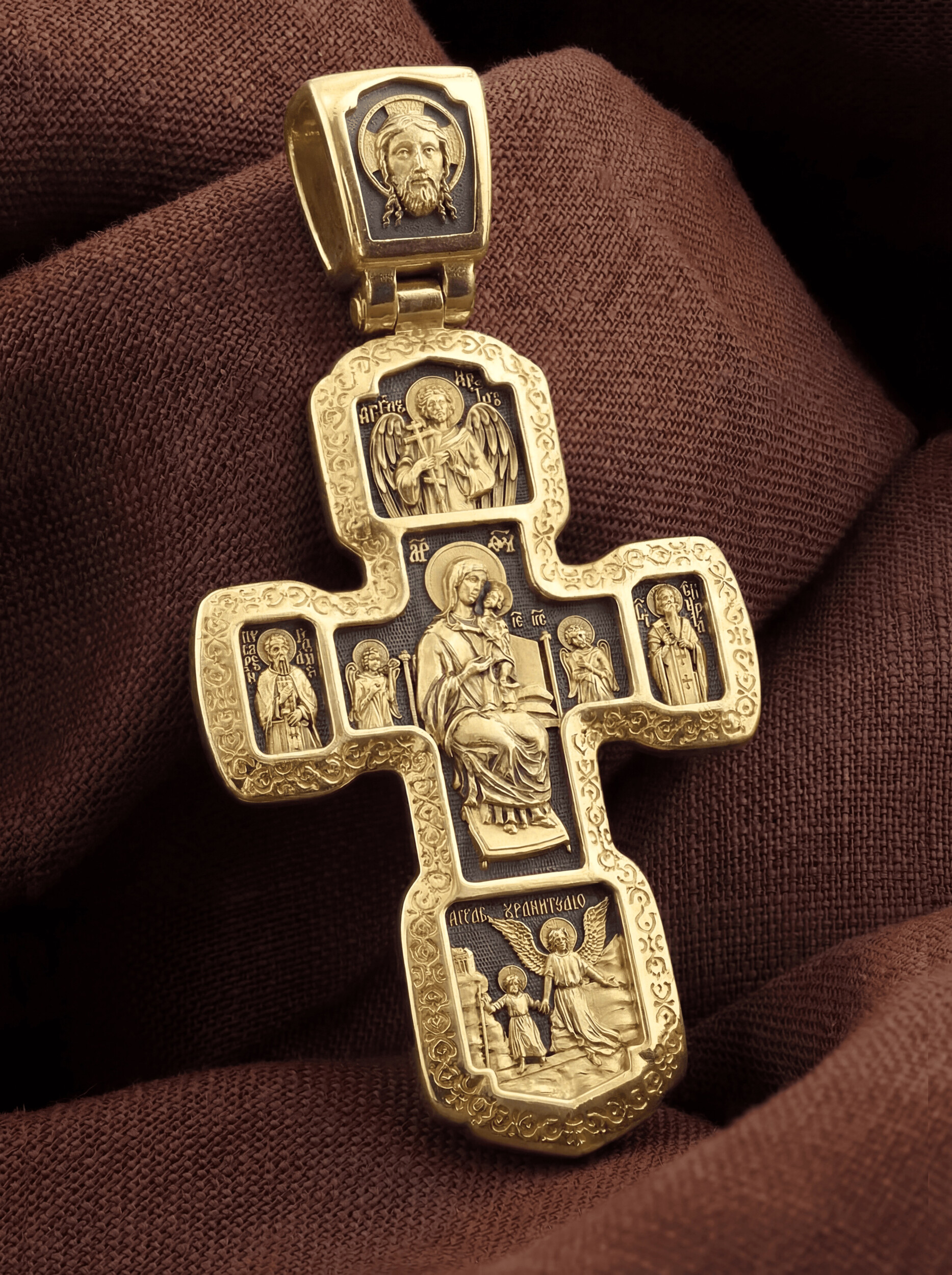 Внизу изображены три святителя, творцы Божественной Литургии. В центре — святой Василий Великий, справа — святой Иоанн Златоуст, а слева — святой Григорий Богослов. В центральной части оборотной стороны Креста изображена икона Божией Матери «Всецарица» или «Пантанасса». Чудотворная икона была написана в XVII веке и находится на Святой Горе Афон. Икона совершила множество чудесных исцелений. Пречистая Богородица наставляет на праведный путь, помогает укрепить веру, найти утешение. По бокам изображены прп. Сергий Радонежский и святитель Спиридон Триумфунский. Сверху и снизу помещены изображения Ангела-Хранителя. На кулонном кольце помещено изображение Спаса Нерукотворного. Ему придается победное и защитное значение.