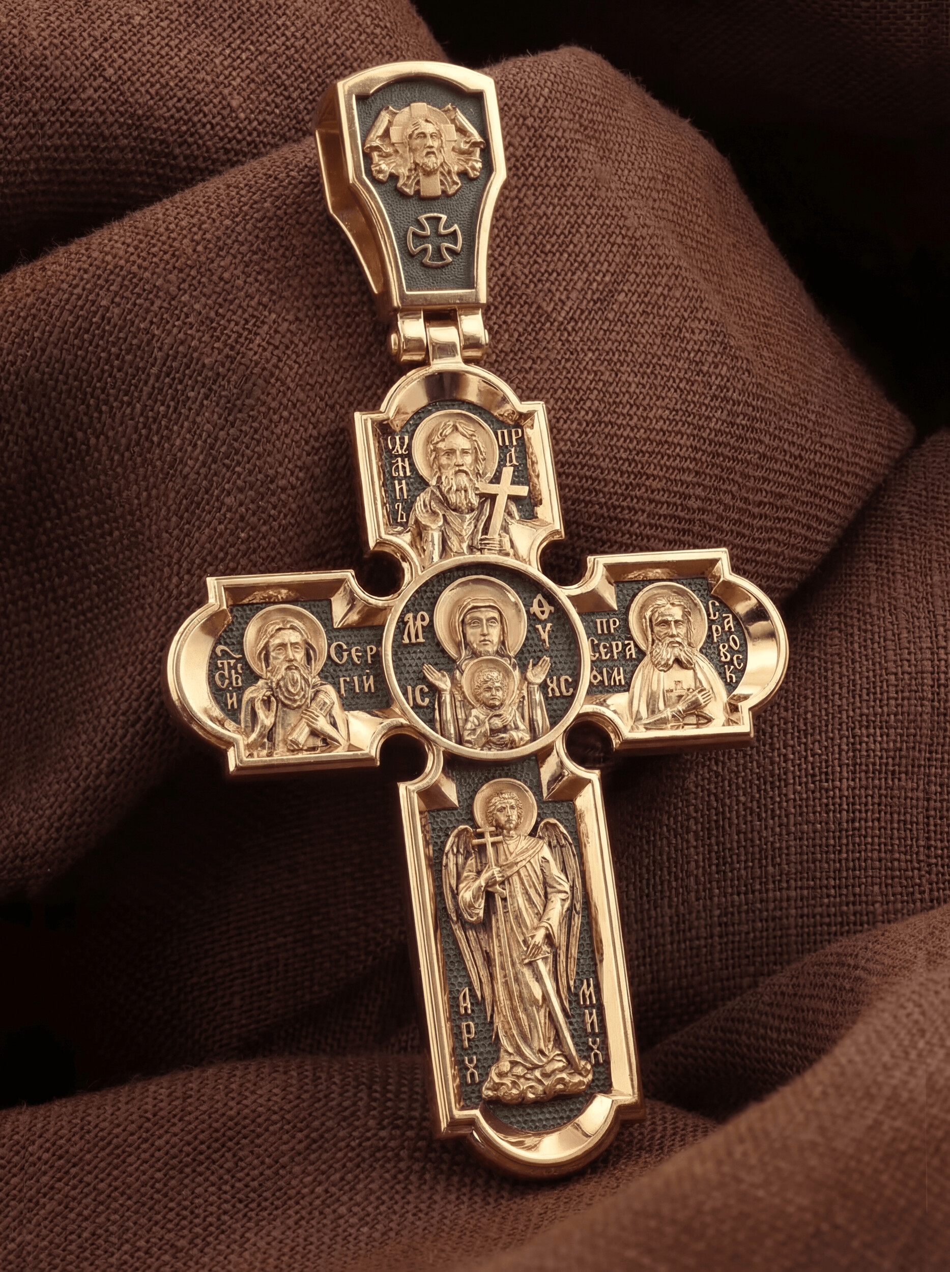 Центральную часть оборотной стороны креста украшает икона Божией Матери «Знамение». Иконы Божией Матери, известные под именем «Знамение», появились на Руси в XI — XII веках, а называться так стали после чудесного знамения от Новгородской иконы, случившегося в 1170 году. Многочисленные списки с иконы Знамения известны по всей России. Многие из них просияли чудесами в местных храмах и были наименованы по месту явления чудес. На кресте внизу изображен Архангел Михаил, слева — Преподобный Сергий Радонежский, справа — Преподобный Серафим Саровский, вверху — Предтеча Господень Иоанн Креститель. На кулонном кольце помещено изображение Спаса Нерукотворного — образ Спасителя, который Он запечатлел на плате и передал для исцеления больному проказой царю Эдессы. Ему придается победное и защитное значение.