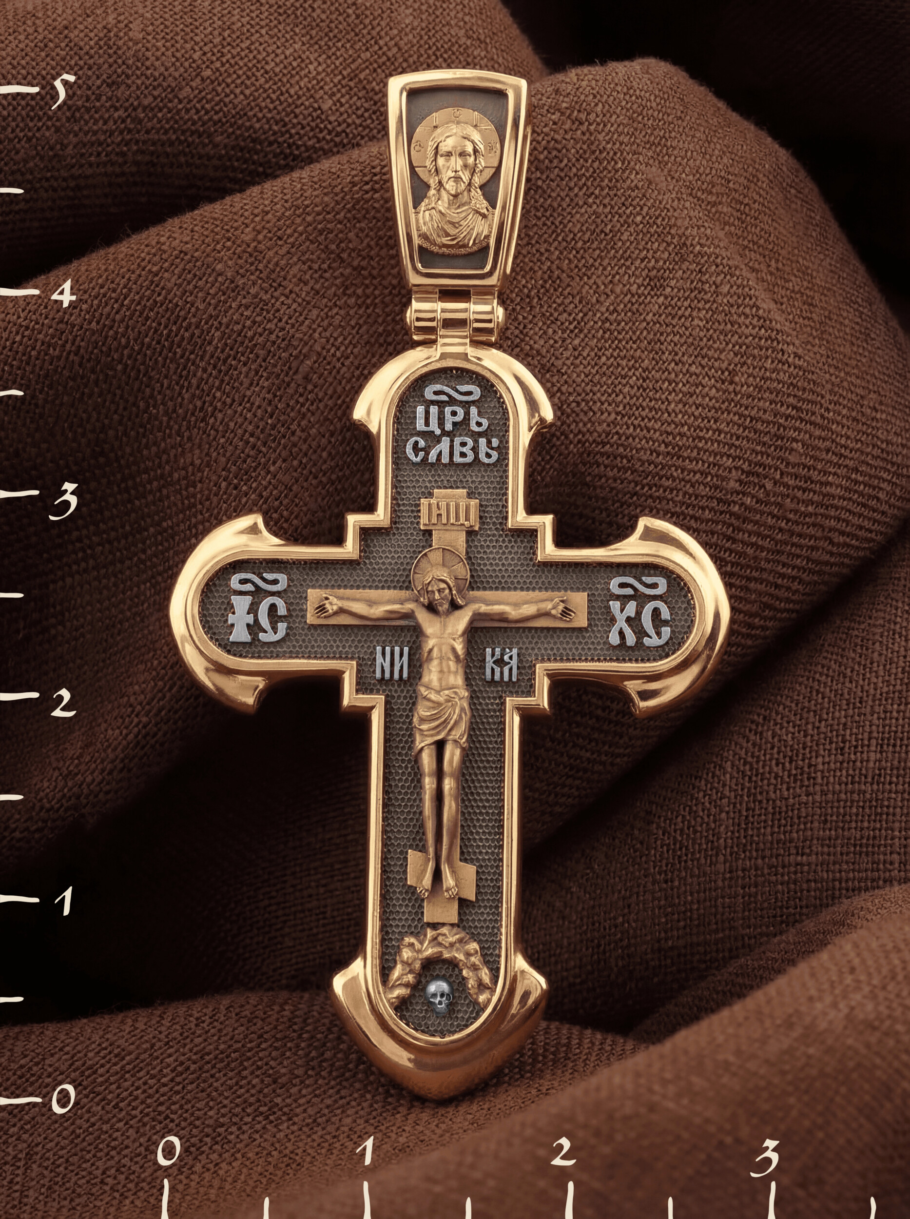 На лицевой стороне креста изображено Распятие Господа нашего Иисуса Христа. В традиции Православия — принято изображать Спасителя как Воскресшего Крестоносителя, призывающего в Свои объятия все концы мира. Его руки имеют горизонтальное положение, открытые ладони пробиты гвоздями, голова наклонена вправо, вокруг головы крестчатый нимб. Крест стоит на горе камней, символизирующих Голгофу, в основании которой различается череп. Это голова Адама. По преданию, тело Адама было погребено Симом, сыном Ноя, на месте, где впоследствии возникла гора Голгофа. Над головой Господа на поперечной перекладине аббревиатура «IНЦI», что символизирует табличку, которая была прибита к Кресту, с надписью «Иисус Назорей Царь Иудейский». Этим иудеи хотели посмеяться над Христом, не зная, что распинают истинного Царя всех царей. По бокам поперечной перекладины титлы святого имени Христа «IC» (Иисус) «ХС» (Христос), и слово «НИКА», что в переводе с греческого означает «победитель». Венчает лицевую сторону креста надпись «Царь Славы».