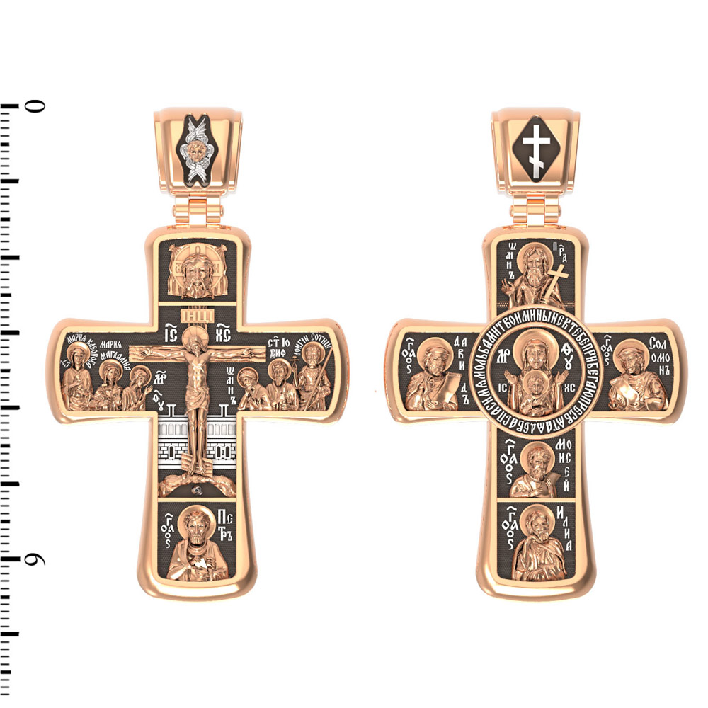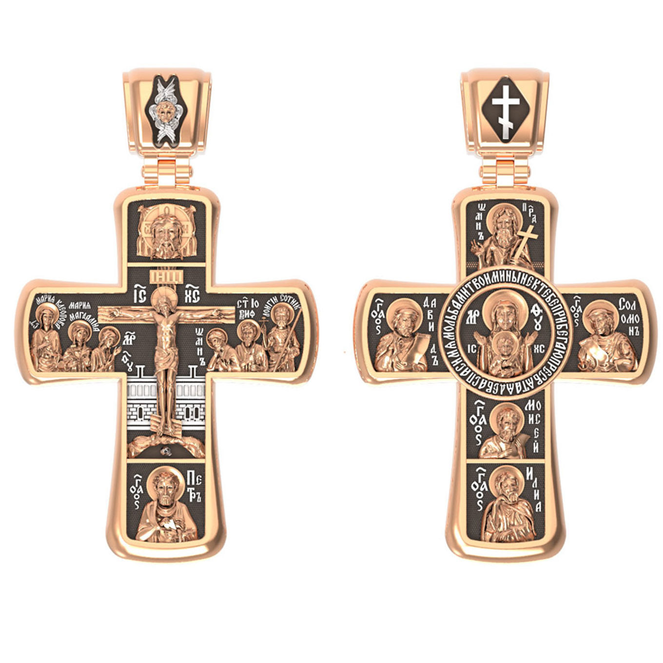 На лицевой стороне креста изображено Распятие Господа Иисуса Христа с предстоящими Ему святыми, которые, по преданию, находились у Креста Господа во время Его казни. Слева — Пресвятая Богородица и жены-мироносицы — равноапостольная Мария Магдалина и святая Мария Клеопова, справа — апостол Иоанн Богослов, прав. Иосиф Аримофейский и мч. Лонгин Сотник.