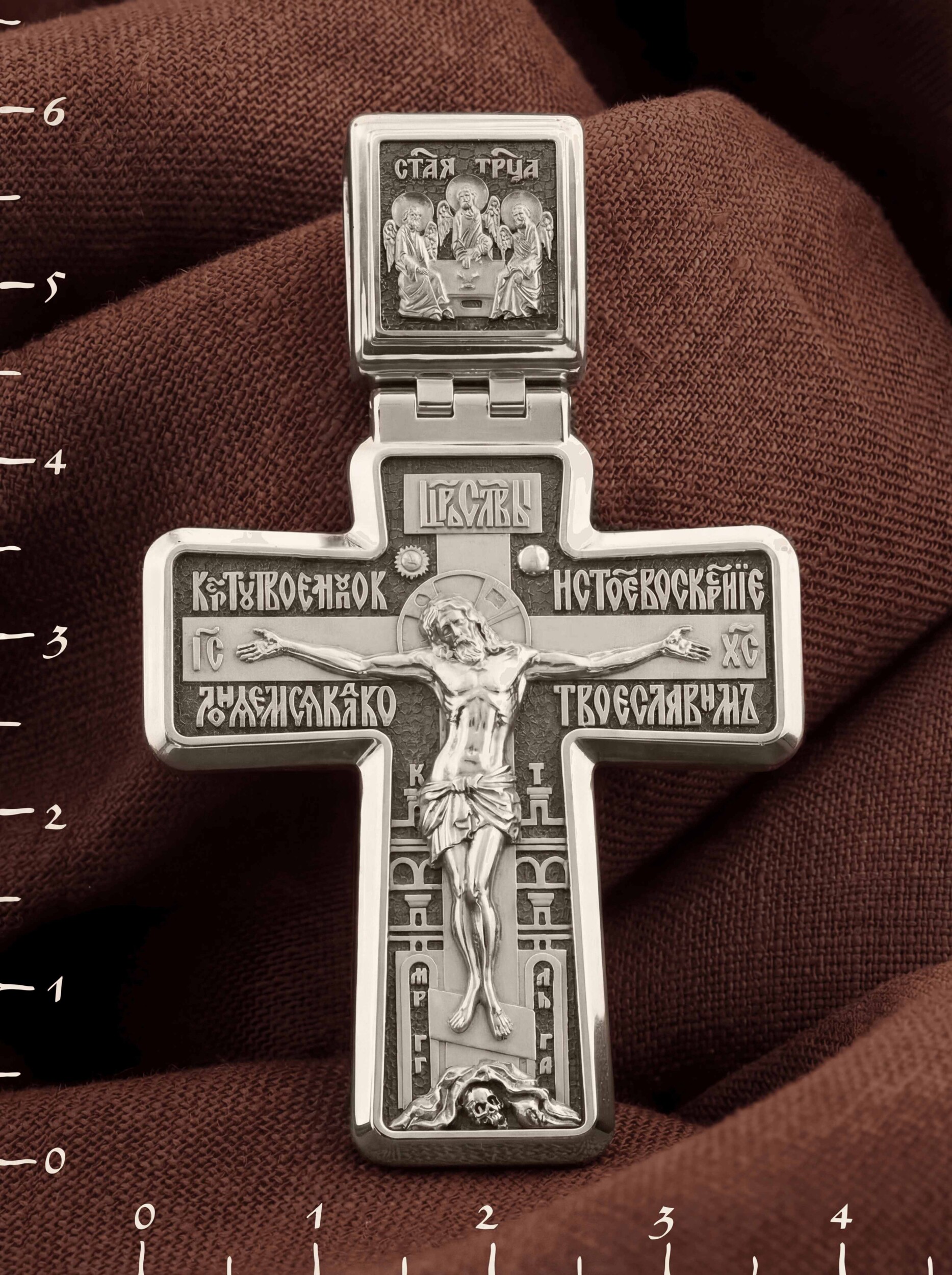 На лицевой стороне креста изображено Распятие Иисуса Христа. Позади Его изображена иерусалимская стена, знак того, что Господь был распят вне стен города. Но вместе с тем стена знаменует и Небесный Иерусалим, путь в который открылся для человечества через Голгофу: «МЛРБ», «Место Лобное Рай Бысть» — написано у ее основания. Рядом с Его образом помещены слова «Царь Славы». Эти слова характеризуют Господа, как Великого Архиерея, победителя смерти. Верхняя перекладина символизирует титло — табличку, на которой, согласно Евангелию, было начертано: «Иисус Назорей Царь Иудейский» (IНЦI). Также Распятие сопровождается надписями, олицетворяющими Христа. Это святое имя Христа «IC» (Иисус) «ХС» (Христос), а так же написан тропарь Животворящему Кресту: «Кресту Твоему поклоняемся, Владыко, и святое воскресение Твое славим». Распятие стоит на горе камней, символизирующих Голгофу, в основании которой различается череп. Это голова Адама. На кулонном кольце помещено изображение Святой Троицы.