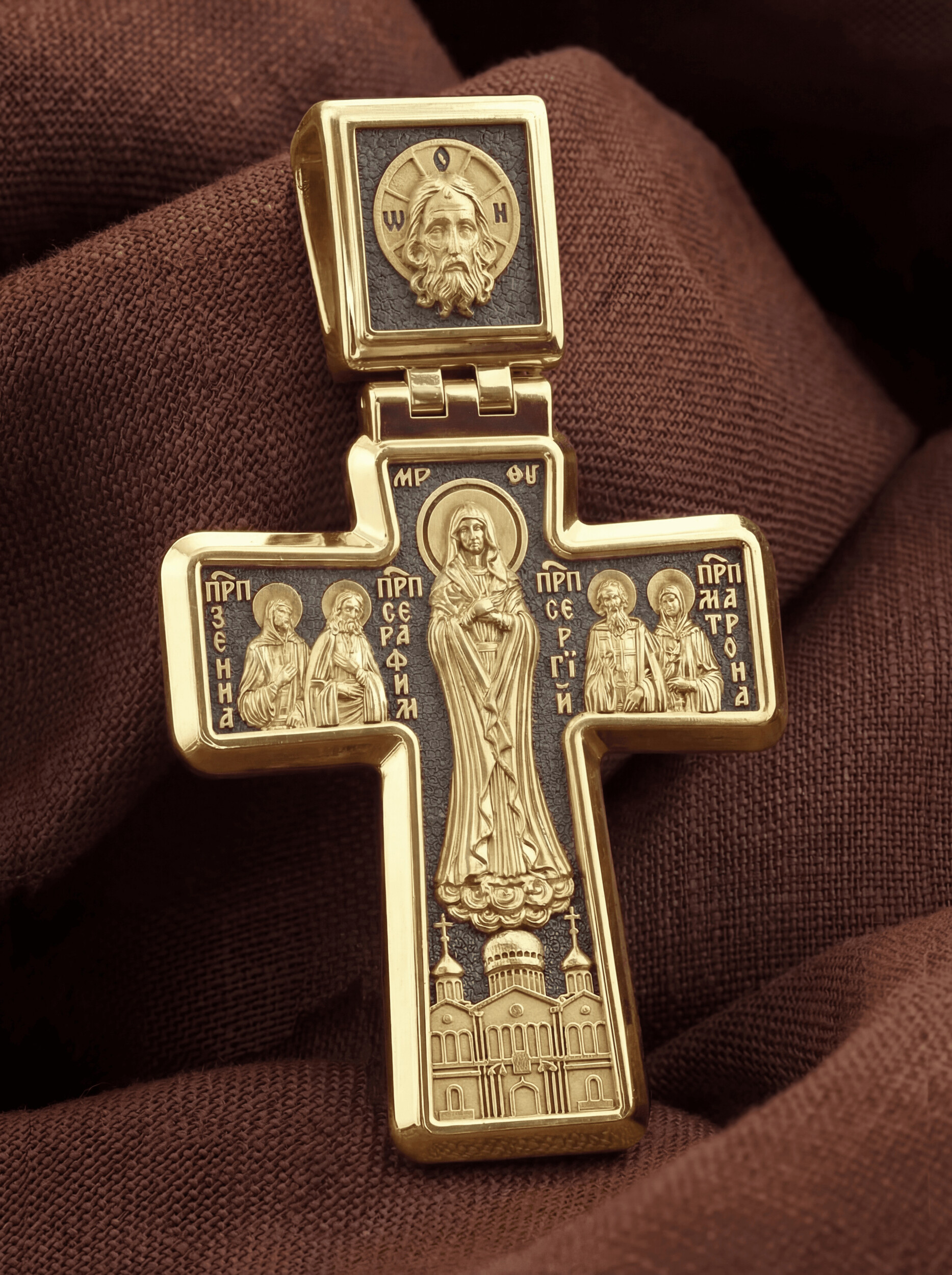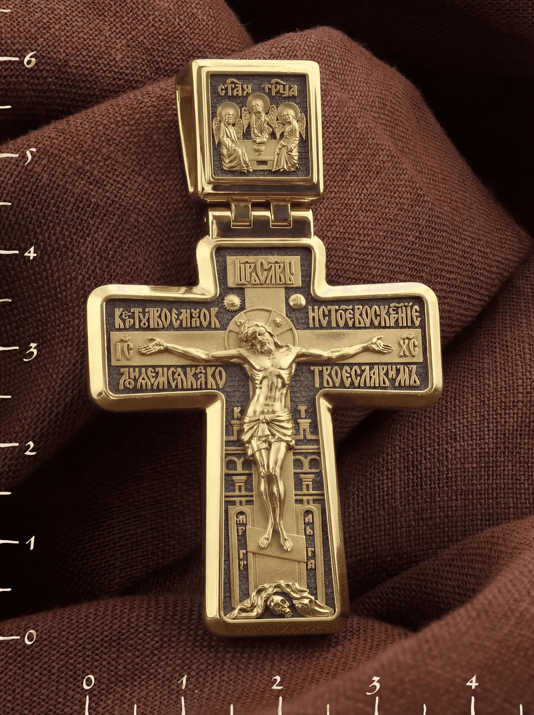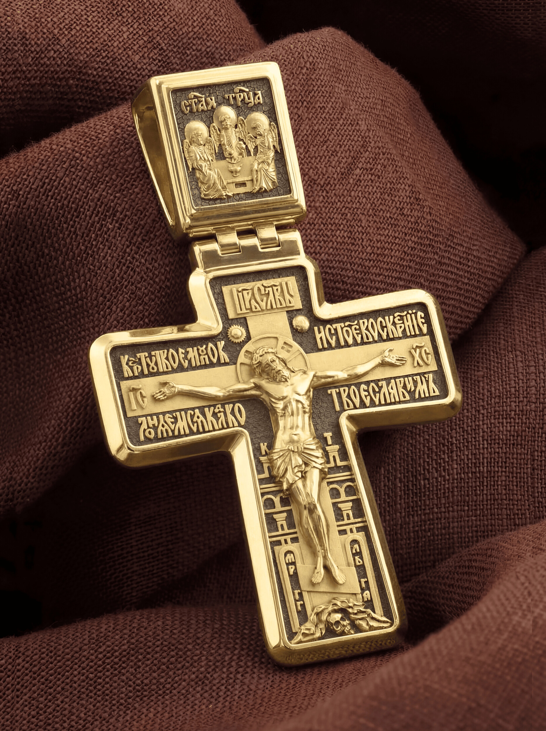 На лицевой стороне креста изображено Распятие Иисуса Христа. Позади Его изображена иерусалимская стена, знак того, что Господь был распят вне стен города. Но вместе с тем стена знаменует и Небесный Иерусалим, путь в который открылся для человечества через Голгофу: «МЛРБ», «Место Лобное Рай Бысть» — написано у ее основания. Рядом с Его образом помещены слова «Царь Славы». Эти слова характеризуют Господа как Великого Архиерея, победителя смерти. Верхняя перекладина символизирует титло — табличку, на которой, согласно Евангелию, было начертано: «Иисус Назорей Царь Иудейский» (IНЦI). Также Распятие сопровождается надписями, олицетворяющими Христа. Это святое имя Христа «IC» (Иисус) «ХС» (Христос), и словосочетание «Сын Божий», а так же написан тропарь Животворящему Кресту: «Кресту Твоему поклоняемся, Владыко, и святое воскресение Твое славим». Распятие стоит на горе камней, символизирующих Голгофу, в основании которой различается череп. Это голова Адама. На кулонном кольце помещено изображение Святой Троицы.