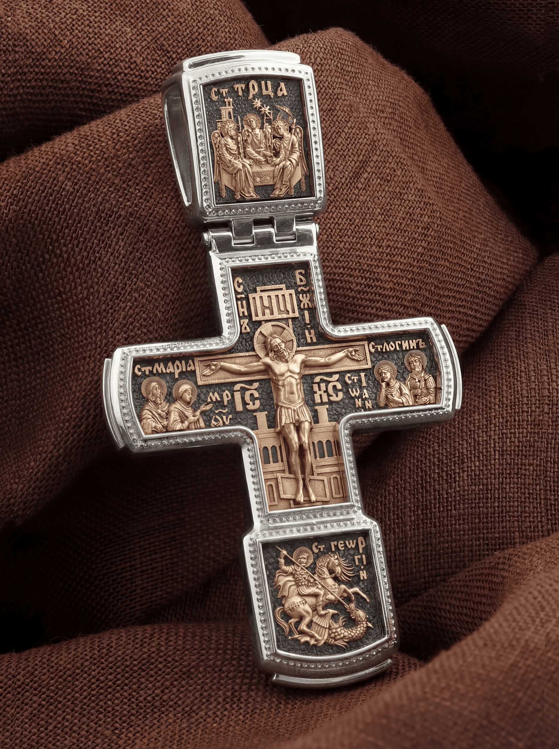 На кресте изображено Распятие Господа нашего Иисуса Христа. Ему предстоят Святая Мария Магдалина, Пресвятая Богородица, апостол Иоанн и Святой Иосиф, свидетели крестных страданий Господа. На оглавии помещена икона Святой Троицы, на которой запечатлено явление Триединого Бога праотцу Аврааму в виде трех ангелов. В нижнем клейме изображено Чудо Святого Георгия о змие. Великомученик Георгий почитается как покровитель воинов, защитник от злых сил, помощник в духовной борьбе.
