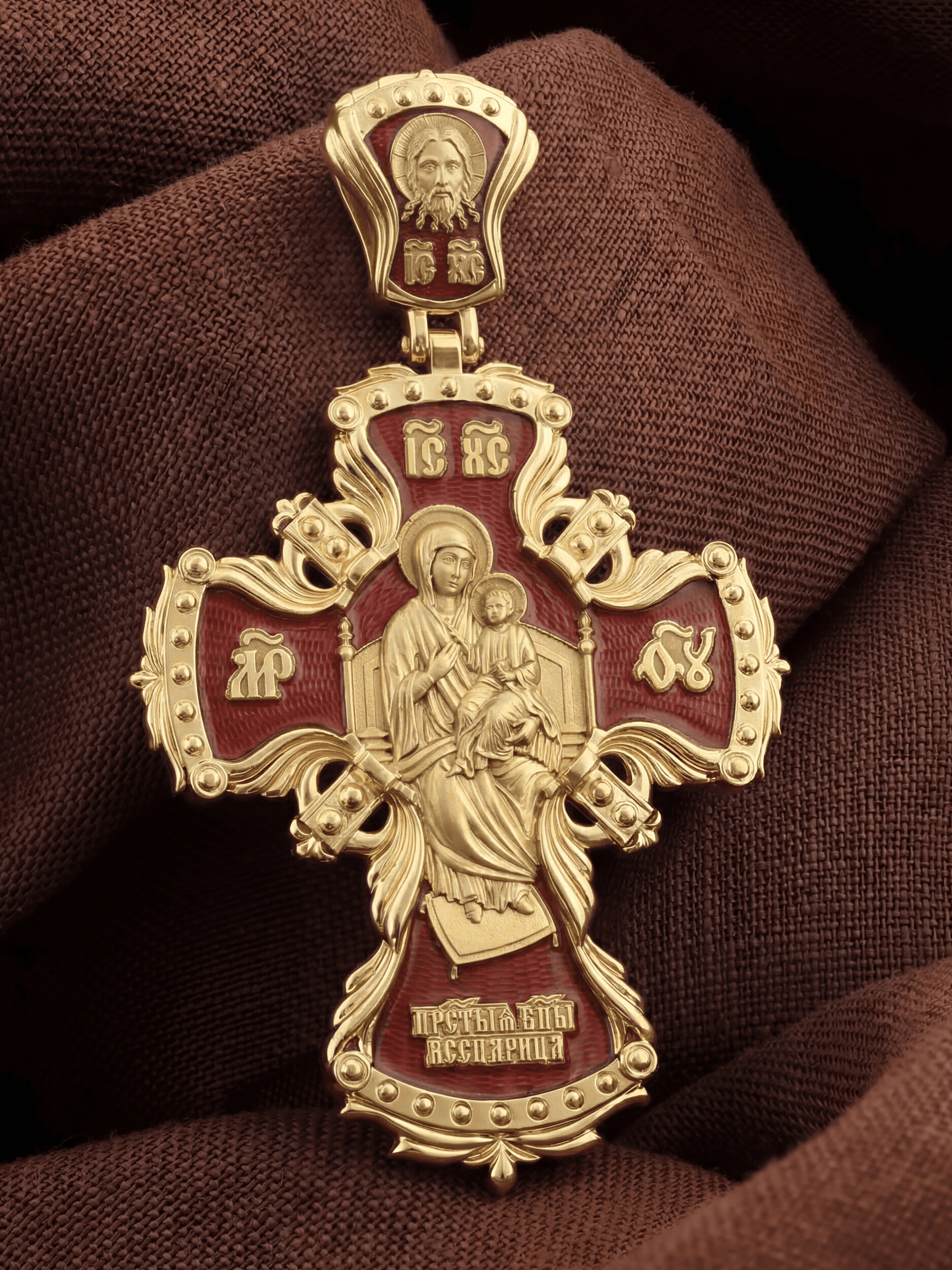 Основной композицией оборота креста является образ Божией Матери «Всецарица», восседающая на царском троне. На руках Ее — Богомладенец Иисус Христос со свитком в левой руке. Пальцы Его правой руки сложены в благословляющем жесте.