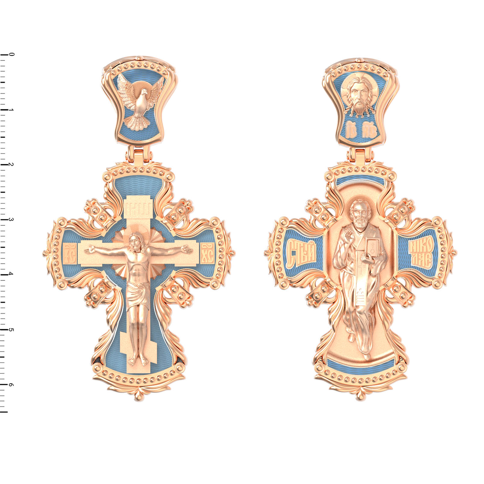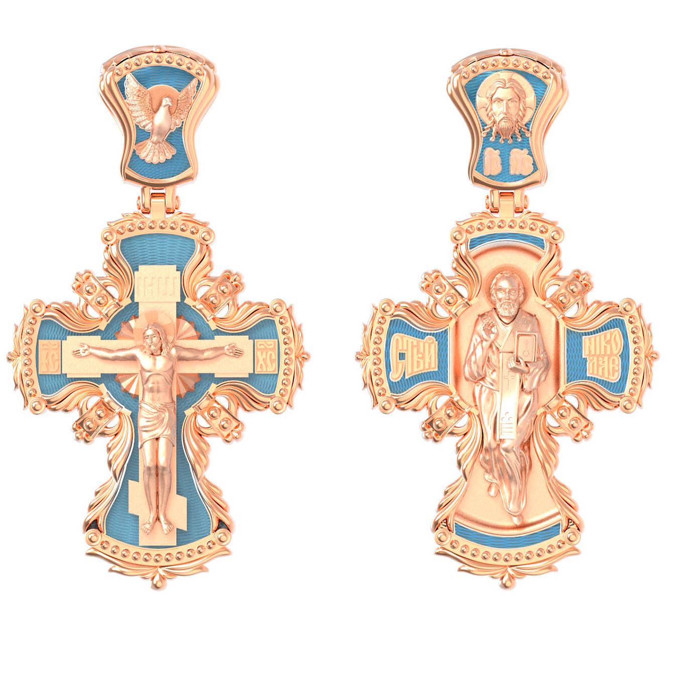 Оборотную сторону креста возглавляет икона святителя Николая Чудотворца, самого почитаемого святого не только в России, но и во всем мире. Николай Чудотворец, помощник в делах, защитник путешествующих, покровитель учащихся, утешитель обиженных и нуждающихся, целитель самых страшных и тяжелых недугов, предстатель и молитвенник за людей перед Богом. На кулонном кольце помещено изображение Спаса Нерукотворного — образ Спасителя, который Он запечатлел на плате и передал для исцеления больному проказой царю Эдессы.