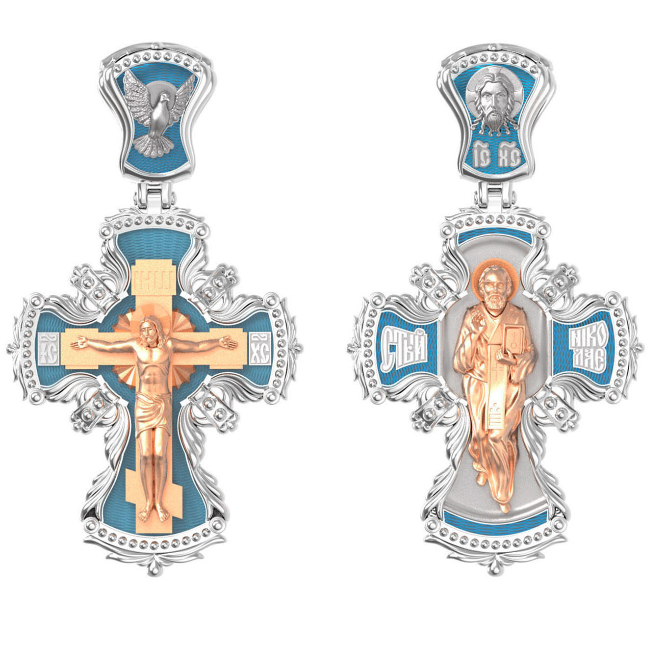 Оборотную сторону креста возглавляет икона святителя Николая Чудотворца, самого почитаемого святого не только в России, но и во всем мире. Николай Чудотворец, помощник в делах, защитник путешествующих, покровитель учащихся, утешитель обиженных и нуждающихся, целитель самых страшных и тяжелых недугов, предстатель и молитвенник за людей перед Богом. На кулонном кольце помещено изображение Спаса Нерукотворного — образ Спасителя, который Он запечатлел на плате и передал для исцеления больному проказой царю Эдессы.