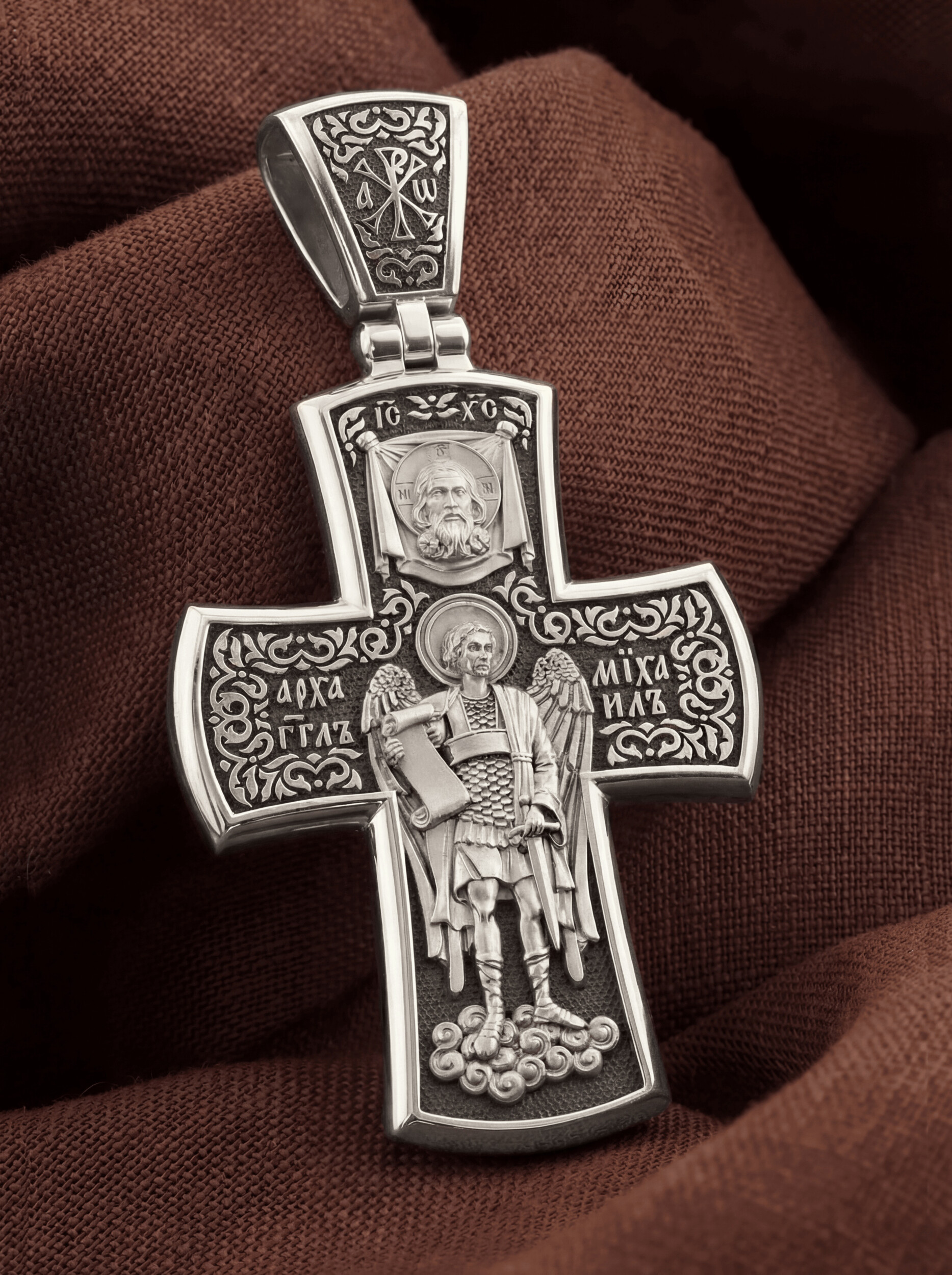 В центре оборотной стороне креста помещен образ Архангела Михаила — верного служителя Божия, который низринул с Неба возгордившегося денницу с другими павшими духами. В Православии его называют Архистратигом, что означает глава святого воинства Ангелов и Архангелов.