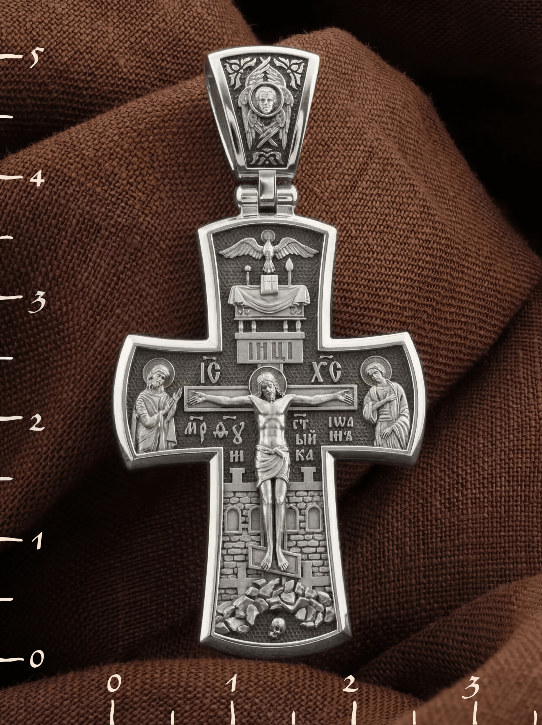На лицевой стороне креста изображено Распятие Господа и Спасителя нашего Иисуса Христа, отдавшего Себя на смерть, для искупления грехов мира. Господь сказал: кто хочет идти за Мною, отвергнись себя, и возьми крест свой, и следуй за Мною. (Мк. 8: 34). Крест является символом жертвенной любви всеблагого Бога к падшим людям, всепобеждающим духовным оружием христиан, основанием и средоточием церковной жизни. На верхней перекладине помещена надпись «IС» « ХС», что означает Иисус Христос. Ниже — слово «НИКА», что означает «победитель». Слева от Распятия изображена Пресвятая Богородица, справа — апостол и евангелист Иоанн Богослов, один из ближайших учеников Иисуса Христа. За Распятием высится Иерусалимская стена, в знак того, что Господь был распят вне стен города. Возвышение, на котором стоит Крест, символизирует гору Голгофу, на которой произошло Распятие. Под подножием Креста изображена покоящаяся голова (череп) Адама.